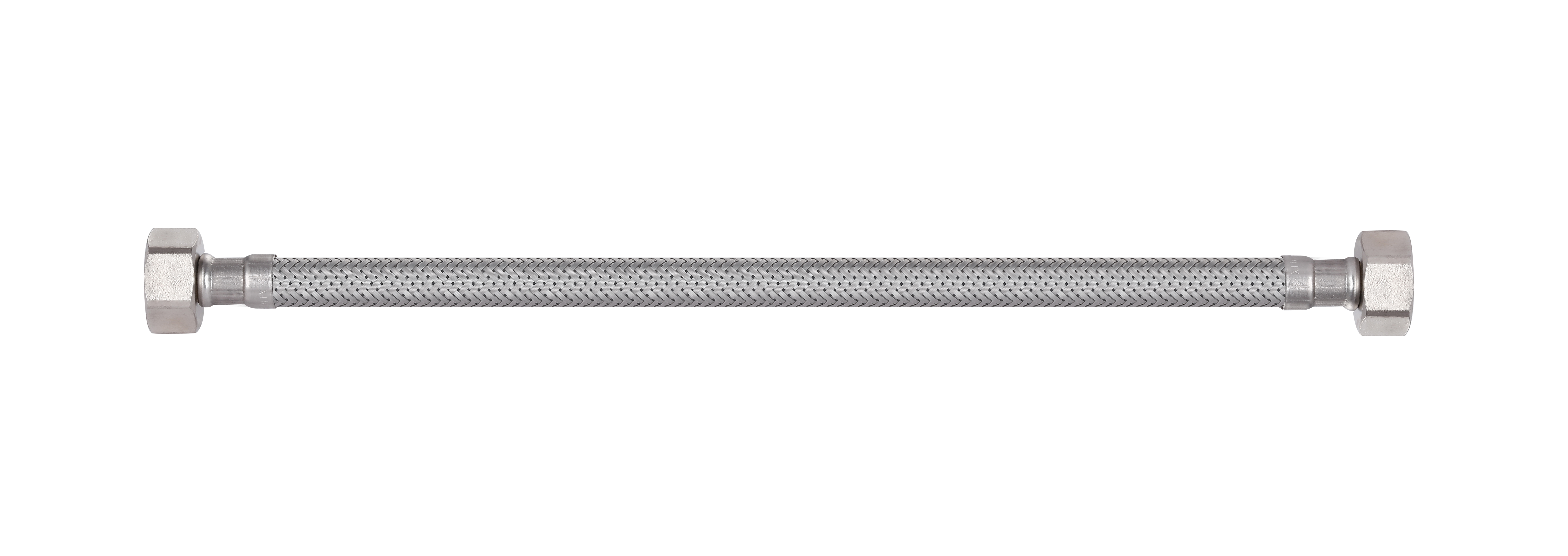 House tilslutningsslange i 1/2" x 1/2" i rustfrit stål med kromoverflade. Slangen er designet til at undgå vridning, hvilket sikrer lang holdbarhed og effektiv funktion. Ideel til forskellige VVS-installationer.