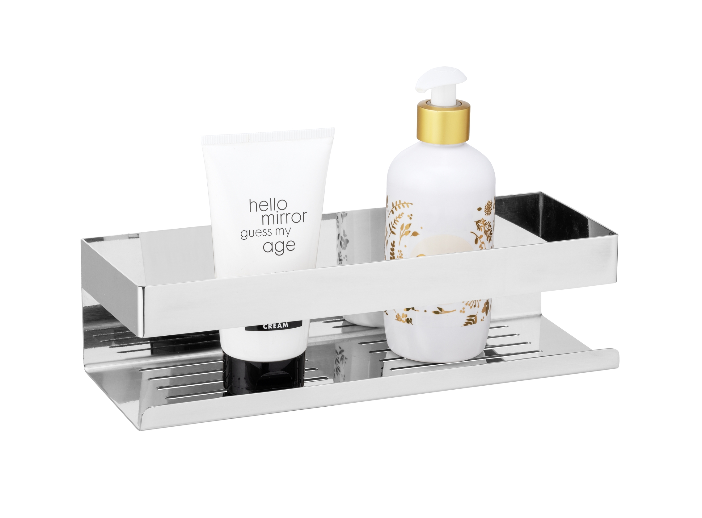 Høj kvalitets væghylde til bad og bruser, lavet af poleret rustfrit stål. Den har et Turbo-Loc® fastgøringssystem, der sikrer et solidt hold uden boring. Hylden er ideel til opbevaring af shower gel, shampoo og plejeprodukter og har en ekstremt fast forankring på glatte overflader. Målene er 30 cm i bredden, 8 cm i højden og 10,5 cm i dybden.