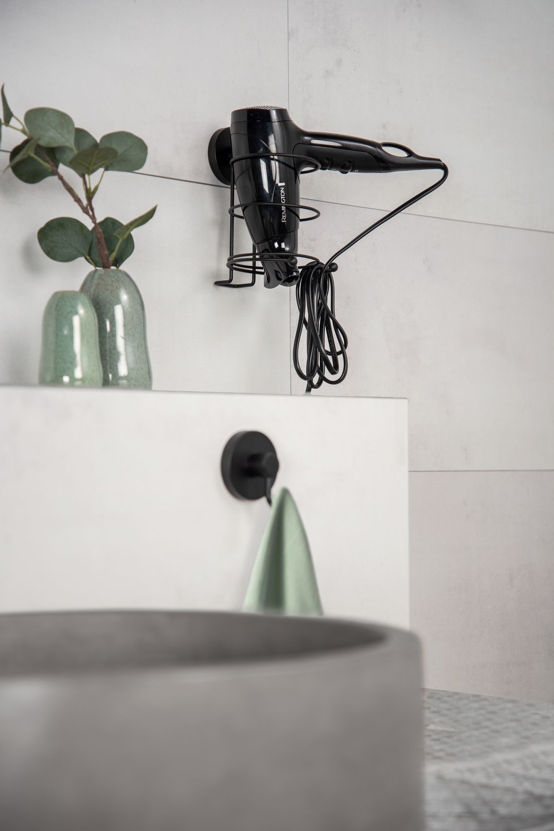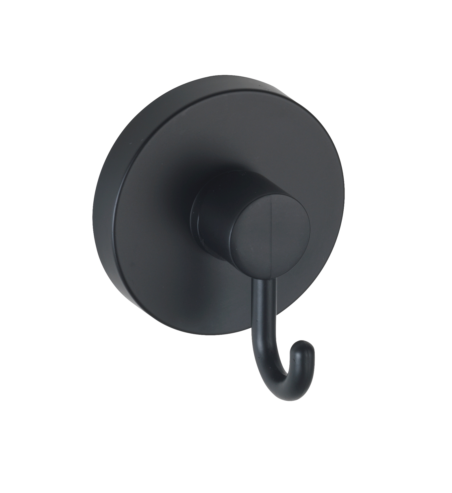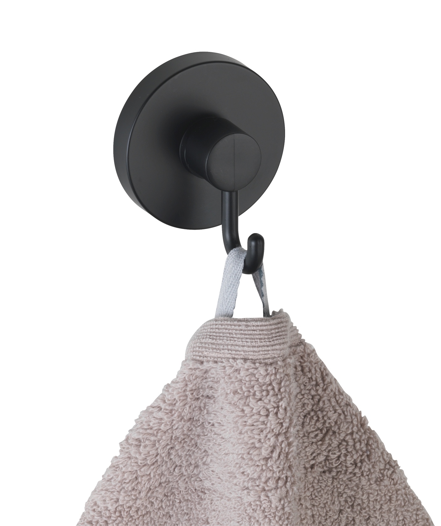 Vacuum-Loc® krog i sort, sæt med 2. Krogene er lavet af høj kvalitets ABS-plastik og kan repositioneres efter behov. Montering kræver ingen boring. Målene er 6 cm i bredden, 6,7 cm i højden og 5 cm i dybden hver.