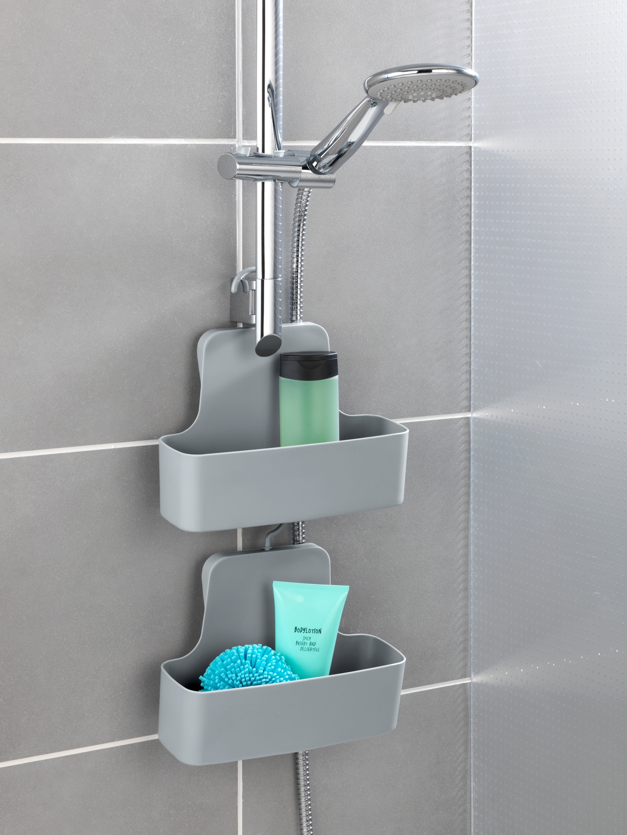 Moderne opbevaringskurv til brusebadet og hele husholdningen. Udstyret med en bevægelig krog for nem ophængning på brusevæg, bruserstang, vandhane eller tørresnor. Praktiske slidser i bunden tillader vandet at løbe fra. Lavet af brudsikkert specialplast i trendy grå. Mål (B x H x D): 26 x 24 x 9 cm.