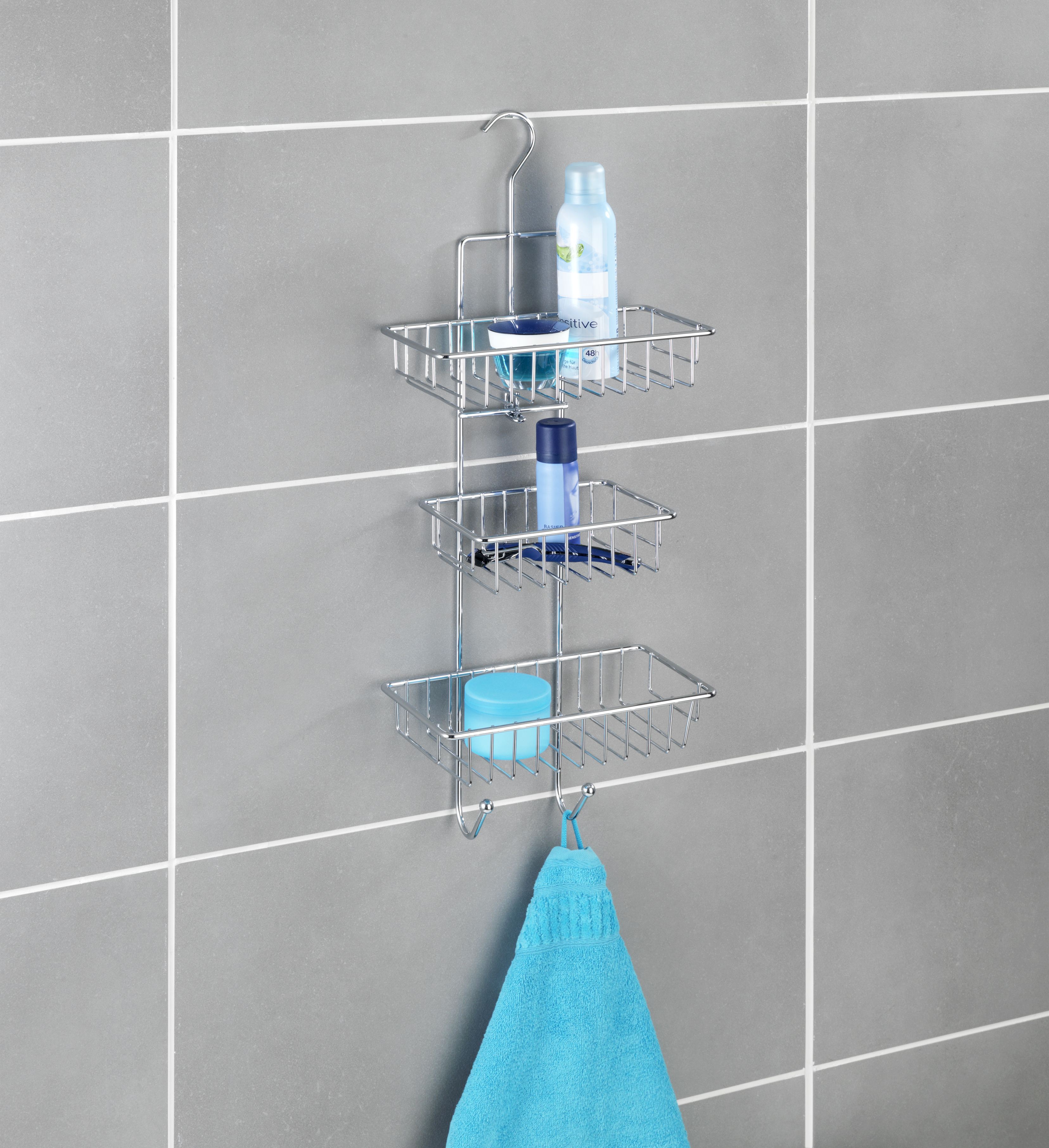 Denne brusehylde er perfekt til badeværelser, hvor der mangler opbevaringsplads. De tre hylder i forkromet stål tilbyder opbevaringsplads af shampoo og andre badtilbehør. Den nederste kurv har også to kroge, hvorpå svampe, børster eller vaskeklude kan placeres. Brusehylden placeres på brusearmaturet ved hjælp af den integrerede krog.