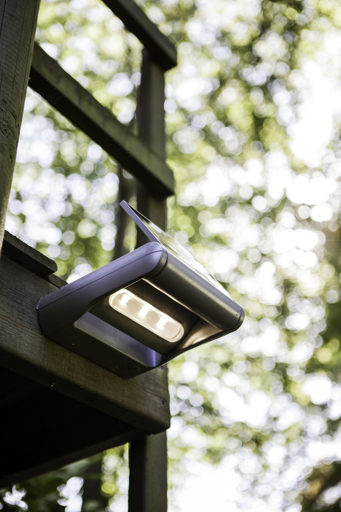Væglampe med integreret solpanel i en enkelt lampehoved-version, der sikrer optimal solenergiudnyttelse. Det klare spotlight kan orienteres i alle retninger. Den tre-trins dæmper giver dig mulighed for at vælge mellem klart og langvarigt lys.