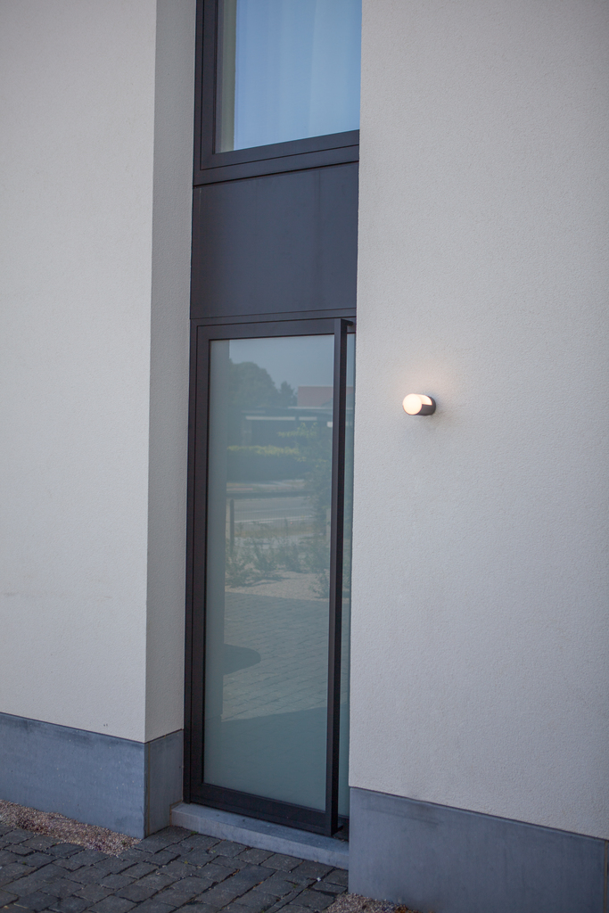 Cylindrisk udendørs LED-lampe med en kombination af mat sort krop og opalhvid diffuser. Den bevægelige lampehoved tilbyder en rotationsmulighed på 350°, hvilket skaber en smuk lysglød på din ydervæg.