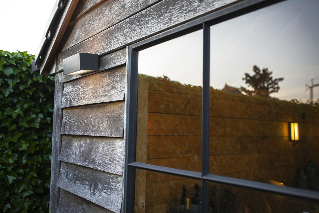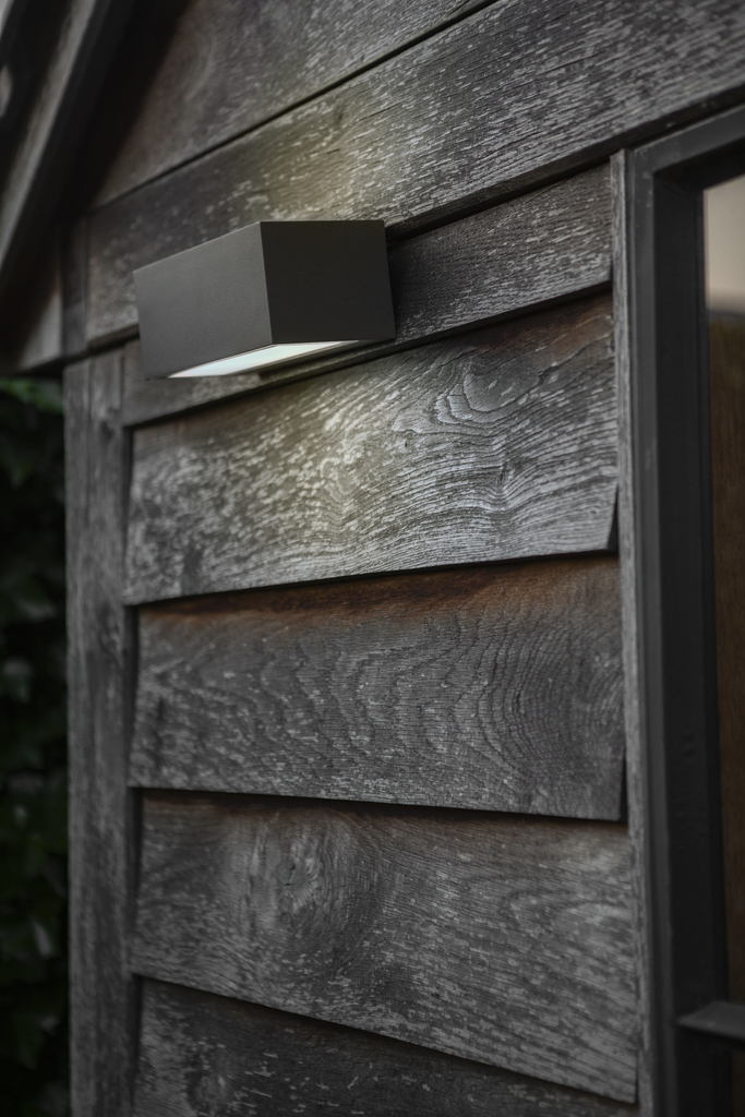 Minimalistisk design men fantastisk lysudbytte. Denne elegante ""murstens""-lampe i trykstøbt aluminium udsender en perfekt tovejsstråle. Ved siden af den faktiske finish: mørkegrå, hvid og rustfri stål introducerer vi nu en helt ny version i en imiteret trælook.