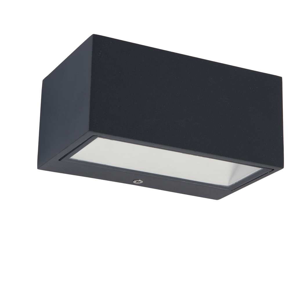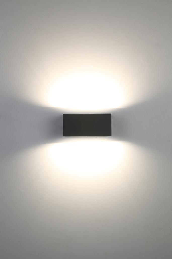 Minimalistisk design men fantastisk lysudbytte. Denne elegante ""murstens""-lampe i trykstøbt aluminium udsender en perfekt tovejsstråle. Ved siden af den faktiske finish: mørkegrå, hvid og rustfri stål introducerer vi nu en helt ny version i en imiteret trælook.