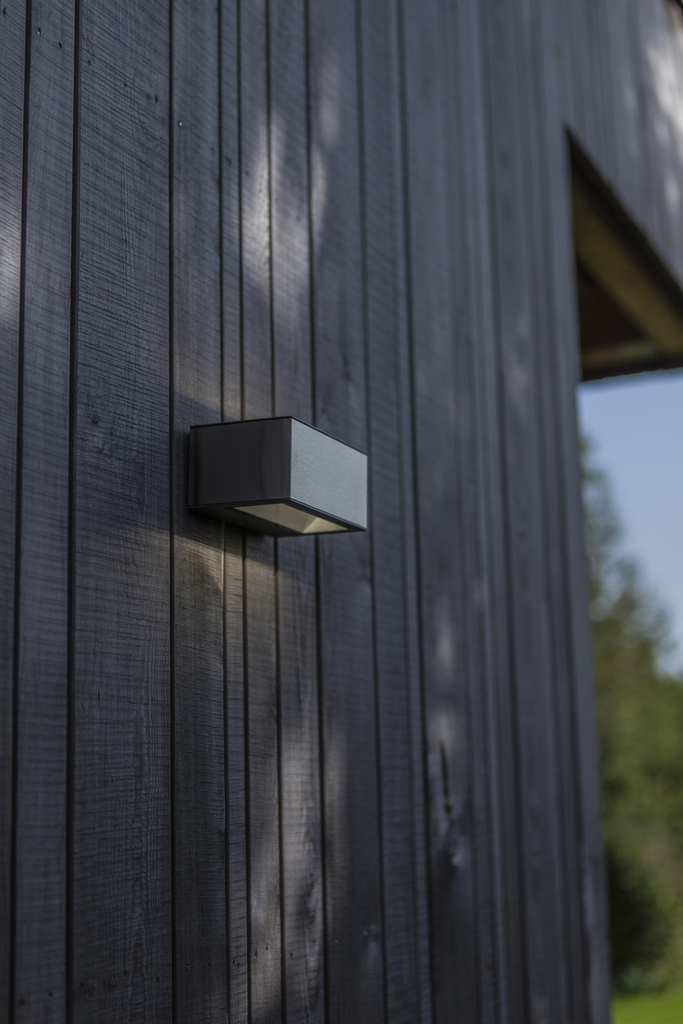Minimalistisk design, men fantastisk lysudbytte. Denne elegante ""murstens""-lampe i trykstøbt aluminium udsender en perfekt tovejsstråle. Ved siden af den faktiske finish: mørkegrå, hvid og rustfri stål introducerer vi nu en helt ny version i en imiteret trælook.