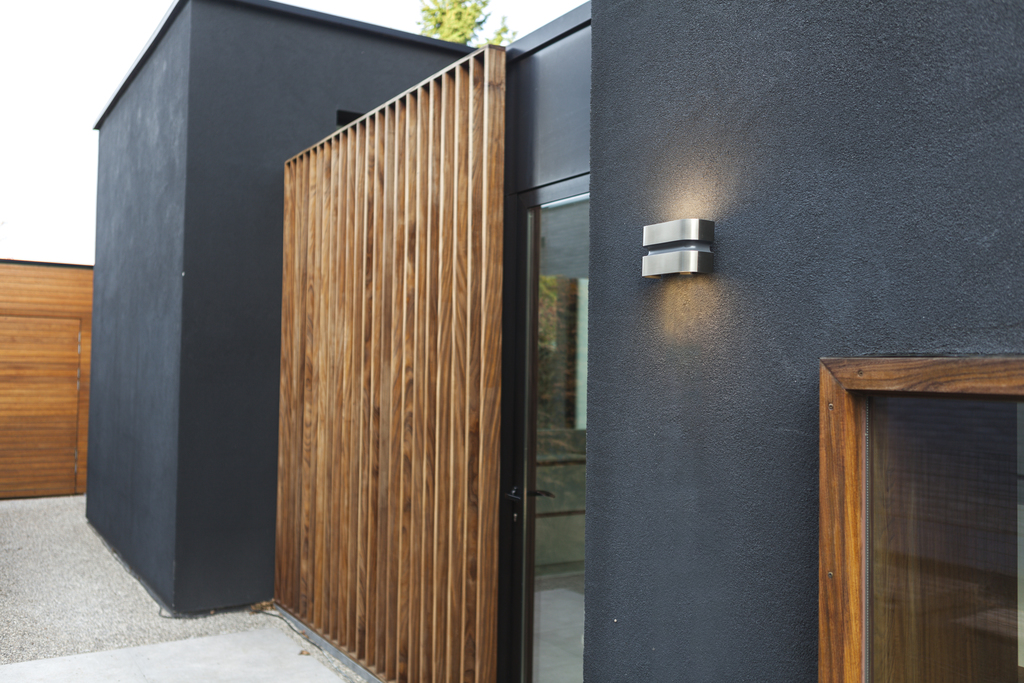 Denne lille Up & Down væglampe i aluminium med rustfrit stål cover har et tidløst design og er slank og effektiv. Rektangulær version medfølger bevægelsessensor.