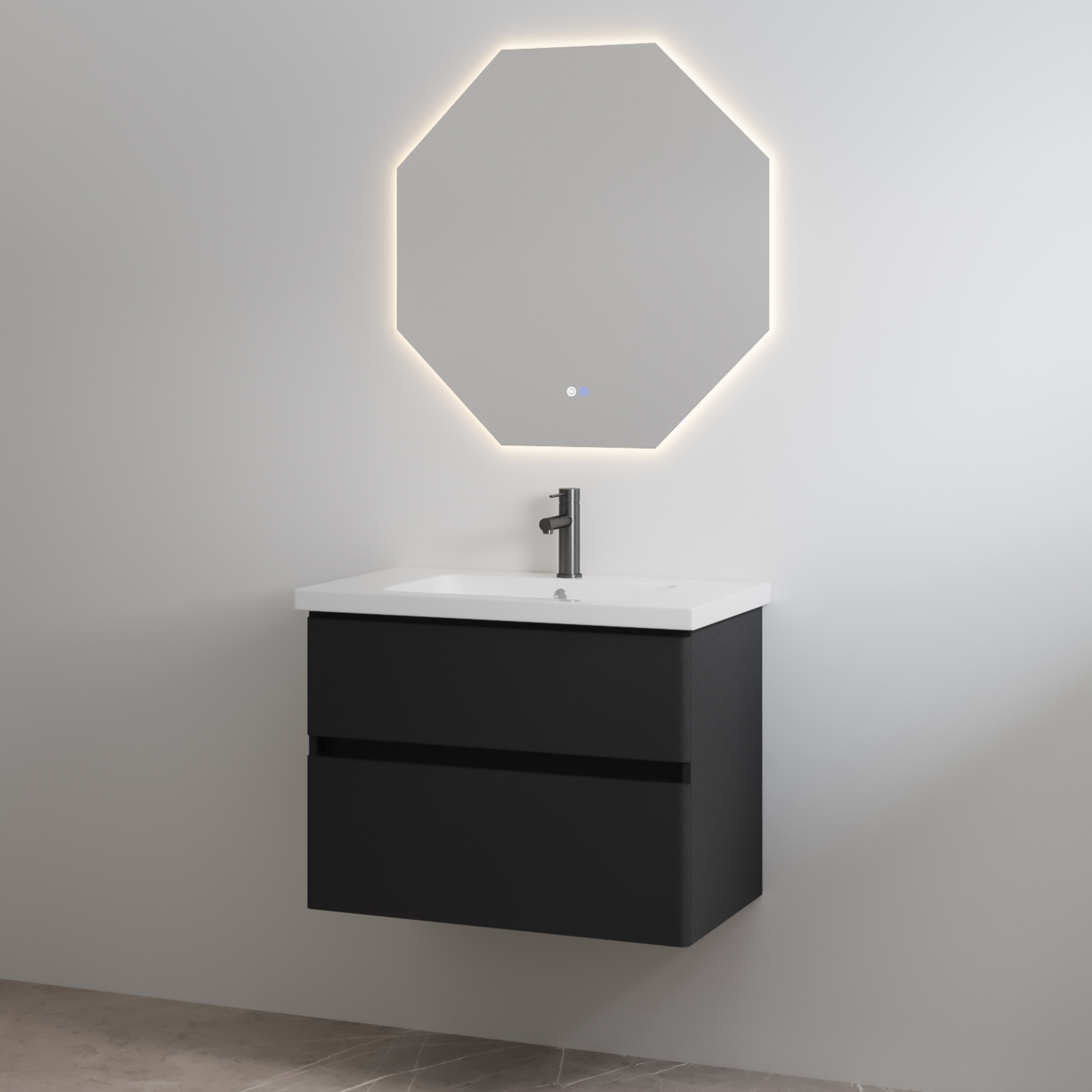 Den keramiske håndvask er udstyret med centralt hanehul og overløb, hvilket sikrer en funktionel og komplet løsning. Møbelsættet er det ideelle valg for dig, der ønsker at kombinere moderne design med varme materialer og høj funktionalitet, og passer perfekt ind i både moderne og klassiske badeværelsesindretninger.