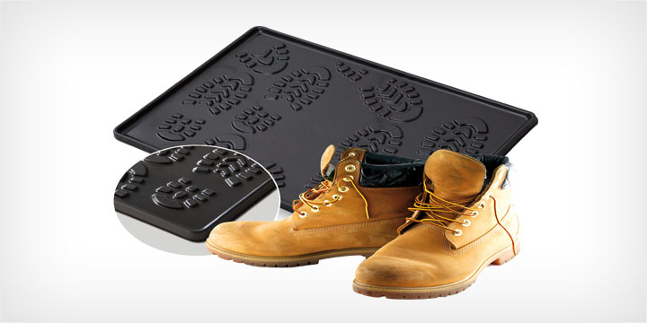 Udstyr dit hjem med en skomåtte, der holder dit hjem rent for beskidte sko, da skomåtten opbevarer dine og dine gæsters snavsede sko. Denne sorte skomåtte har en rektangulær form, og den er udsmykket med fodspor. Måtten er fremstillet i plastik, så den er nem at rengøre.