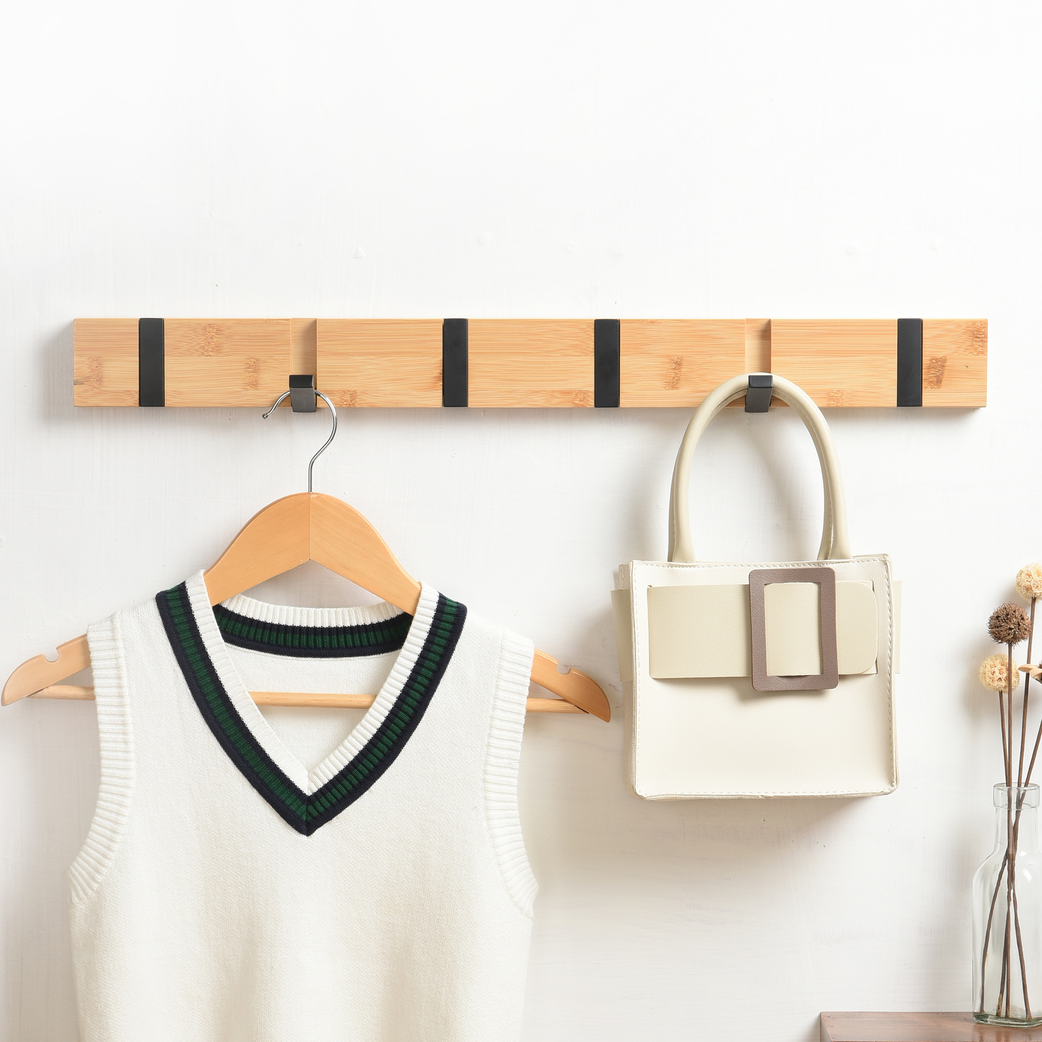 Med klik-funktionen kan knagerne nemt klikkes op igen, når de ikke er i brug, hvilket skaber et clean design og et ryddeligt udtryk. Uanset om du bruger den i entréen, soveværelset eller badeværelset, hjælper Millex bambus knagerække med at holde orden, samtidig med at den ser flot ud.