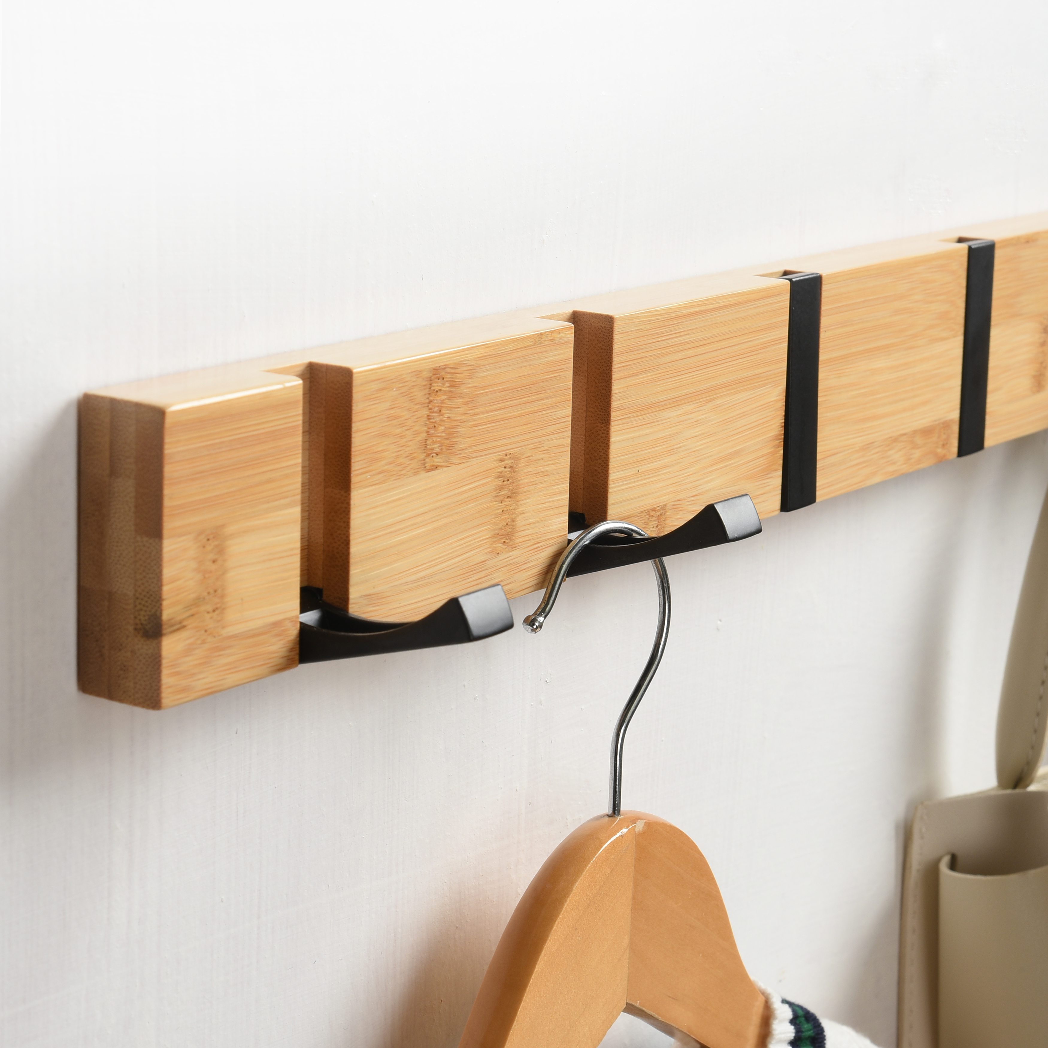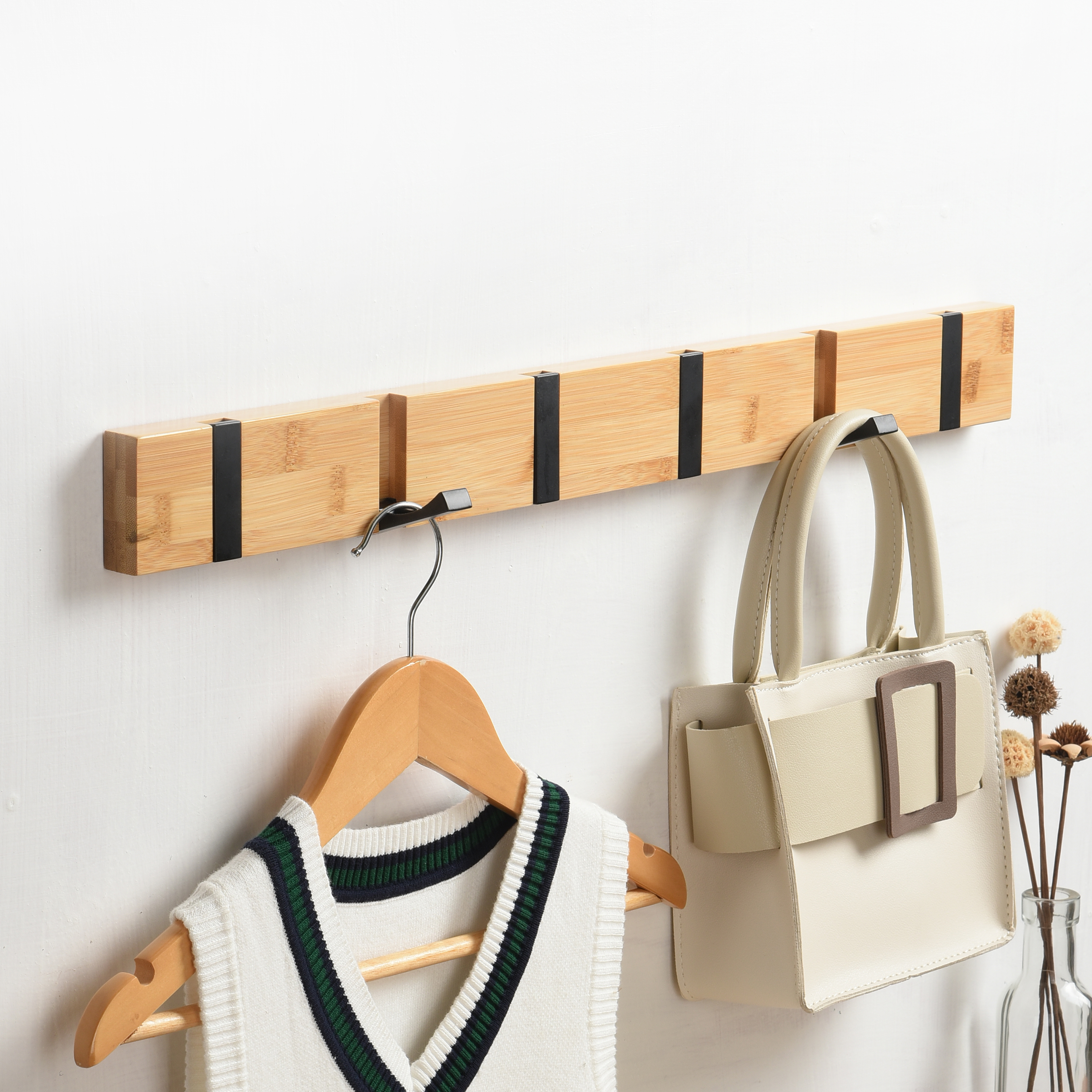 Millex bambus knagerække med klik-funktion kombinerer stil, smart design og funktionalitet. Denne elegante knagerække giver dig mulighed for at hænge dit tøj og tilbehør op, samtidig med at den tilfører en varm, naturlig æstetik til dit rum.