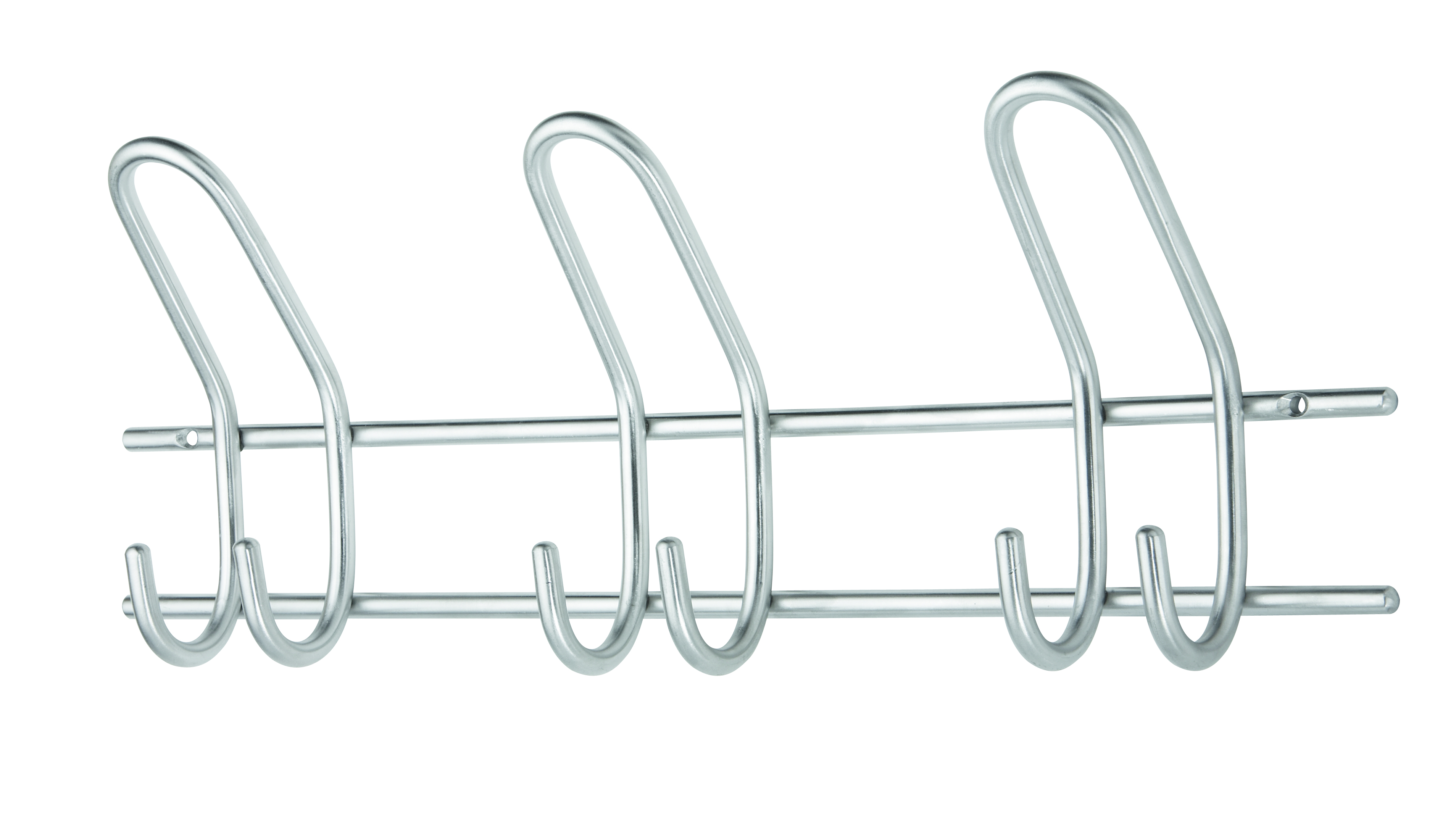 Denne klassiske knagerække passer ind i ethvert hjem med sit elegante og simple design. Knagerækken er udstyret med 3 buede dobbeltkroge, der tilsammen udgør 6 knager, hvor overtøj, tasker og tilbehør kan opbevares. Dobbeltkrogene formår på samme tid at øge kapaciteten og spare plads. Knagerækken er lavet af rustfrit stål, således at den er slidstærk og kan holde til hverdagens brug og slid. Den er nem at installere, da den monteres med de inkluderede skruer og rawplugs.