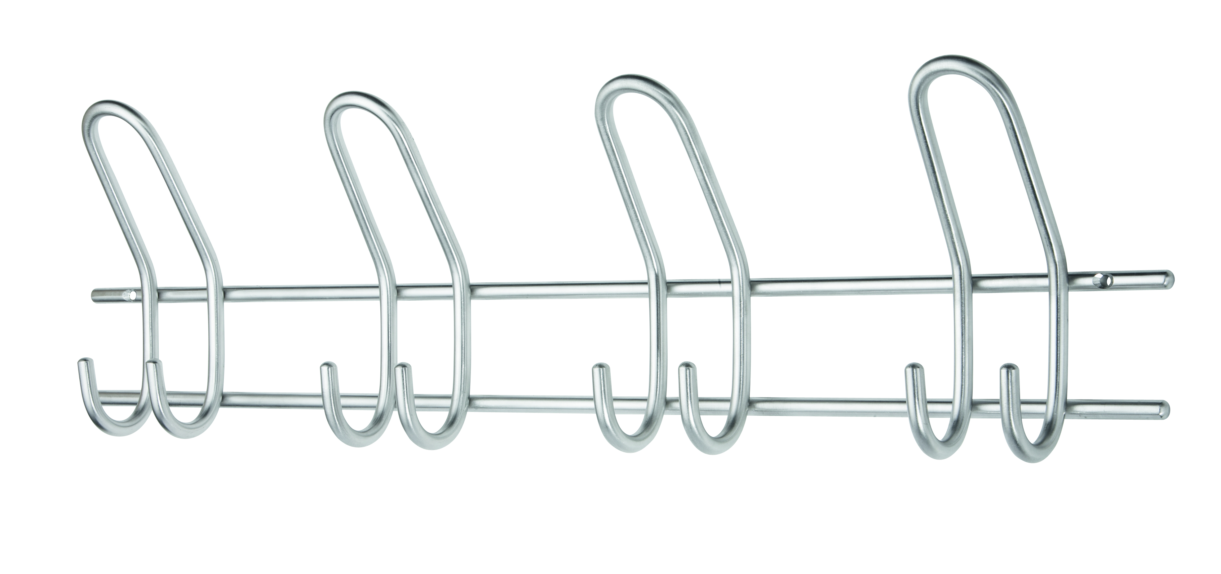 Denne klassiske knagerække passer ind i ethvert hjem med sit elegante og simple design. Knagerækken er udstyret med 4 buede dobbeltkroge, der tilsammen udgør 8 knager, hvor overtøj, tasker og tilbehør kan opbevares. Dobbeltkrogene formår på samme tid at øge kapaciteten og spare plads. Knagerækken er lavet af rustfrit stål, således at den er slidstærk og kan holde til hverdagens brug og slid. Den er nem at installere, da den monteres med de inkluderede skruer og rawplugs.