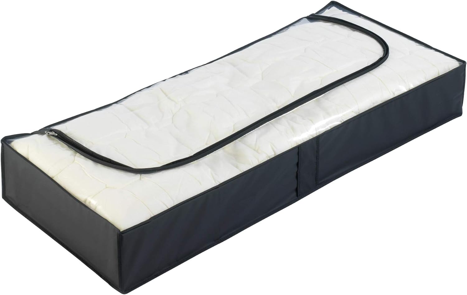 Til pladsbesparende opbevaring af sæsonbetonet tekstil er denne opbevaringsløsning ideel til placering under sengen eller i garderoben. Den har et stort vindue, så du nemt kan se indholdet, samt en lynlås på tre sider for nem adgang. Fremstillet af aftørrelig plastfolie (PEVA) i sort, måler den 107 cm i bredden, 16 cm i højden og 46 cm i dybden.