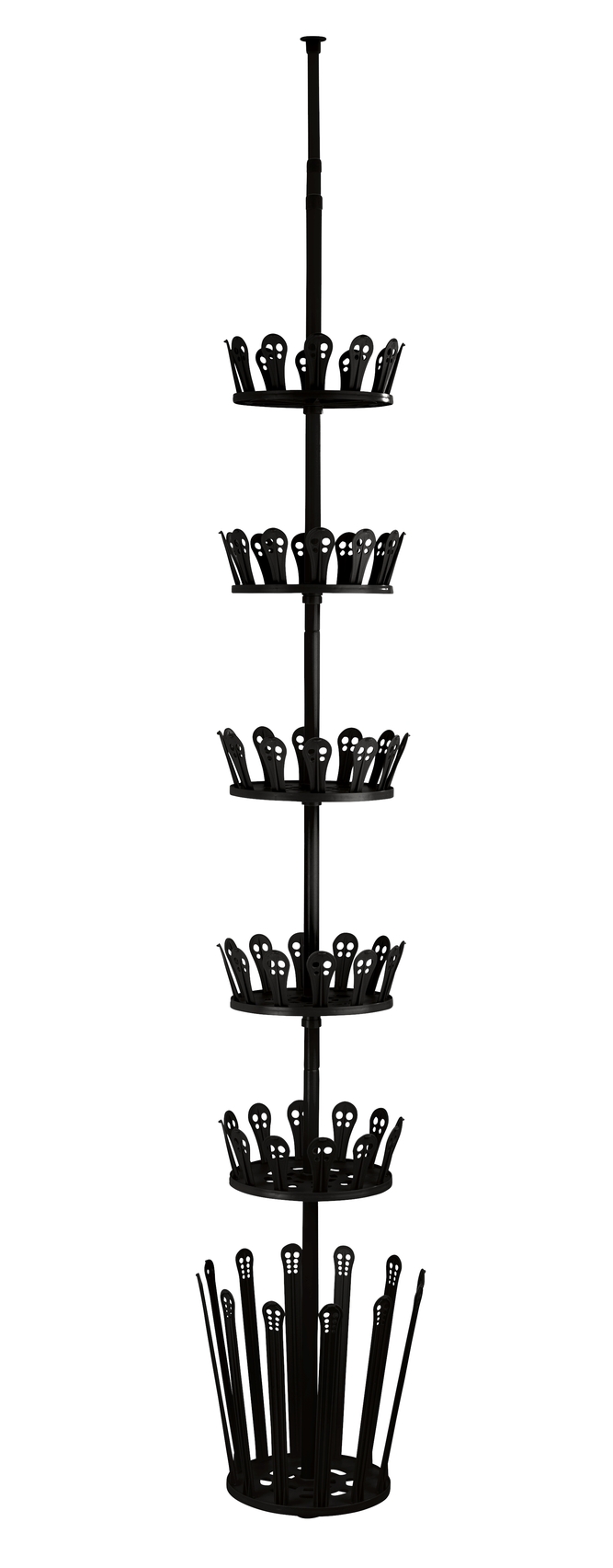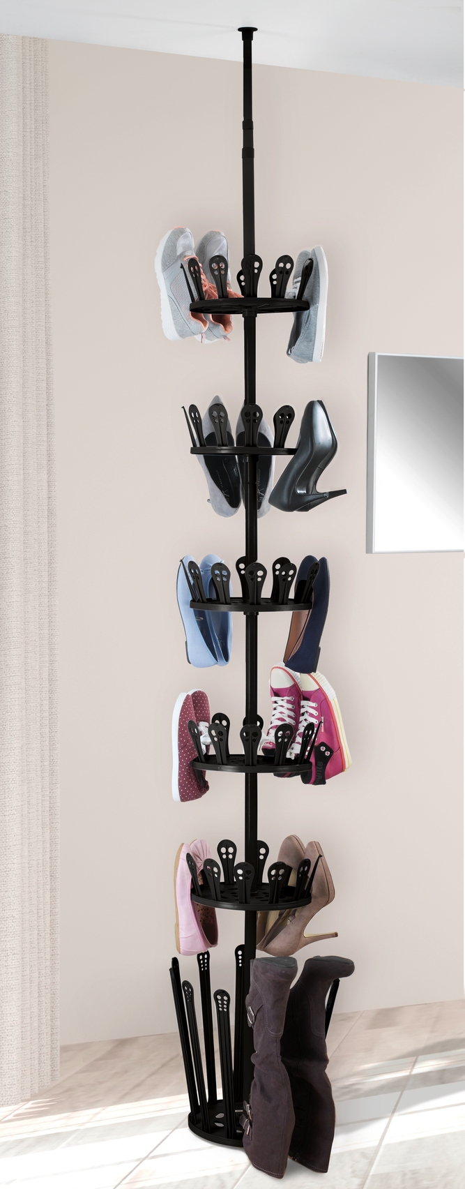 Hvor skal alle skoene være? Hvis du søger en pladsbesparende opbevaringsløsning til sko og støvler, er WENKOs teleskop-skoereol Achilles det rette valg. Her opbevares dine sko lodret og effektivt. Det solide sko- og støvlereol i sort monteres nemt uden boring ved at klemme det fast mellem gulv og loft. Den metalbaserede teleskopstang kan justeres i højden fra 1 til 3 meter, så den passer til din loftshøjde. Med en diameter på 30 cm sparer reolen masser af plads i entréen, på klædeskabet eller i små rum. På de fem plastikringe kan du opbevare op til 30 par sko, og på en ekstra ring kan du lægge 6 par støvler. Skoene sættes på de sorte plastikholdere og opbevares overskueligt.