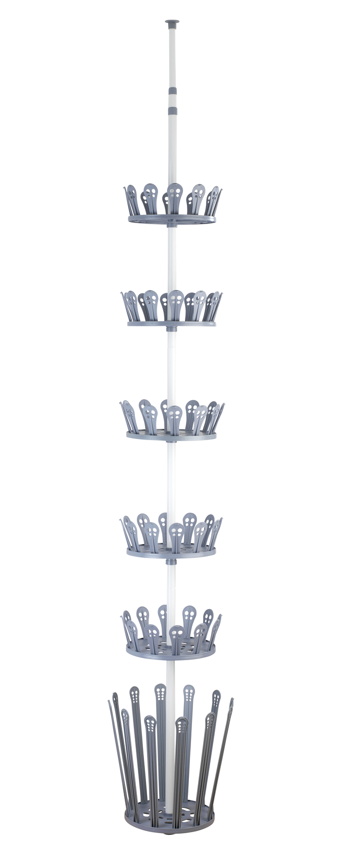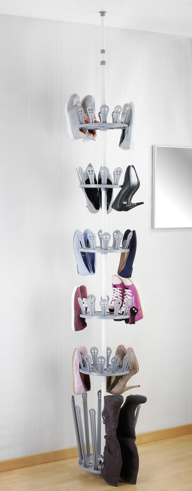 Dette stabile stativ er perfekt til opbevaring af op til 30 par sko og 6 par støvler, og det kombinerer både funktionalitet og stil. Med twistbare holdere og højdejusterbare indstillinger er det nemt at tilpasse efter dine behov. Montering er enkel, da stativet blot skal klemmes mellem gulv og loft, hvilket gør det både pladsbesparende og praktisk i ethvert hjem. Stativet måler Ø 30 x 250-310 cm og kommer i en skinnende sølvfarve. Det er fremstillet i forkromet metal, hvilket sikrer både styrke og et moderne udseende, der passer ind i de fleste rum.
