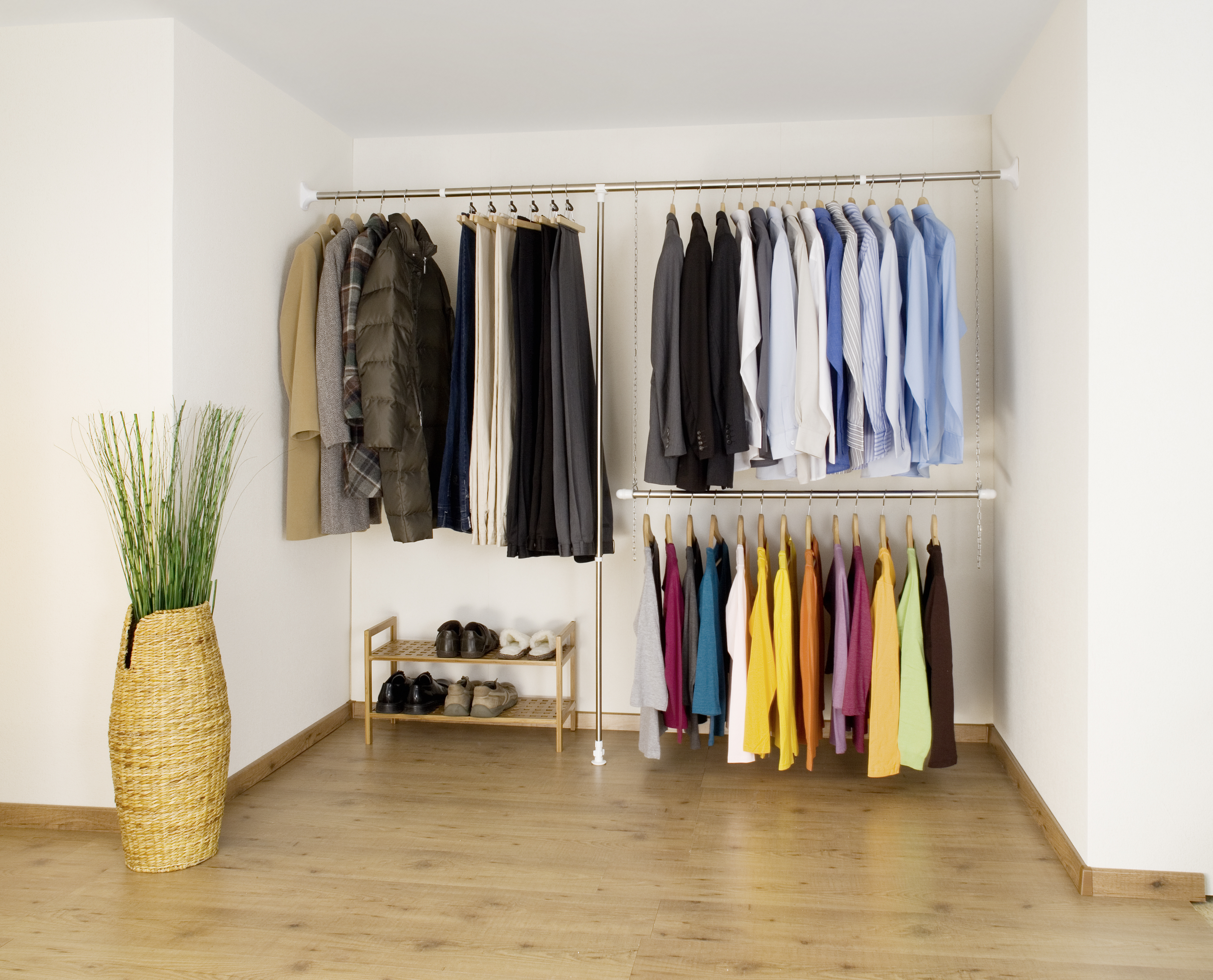 Drøm om en walk-in garderobe med masser af plads til kjoler, frakker, overdele, bukser og skjorter. Dette fleksible tøjstativsystem består af en teleskopstang (Ø 3 x 150-245 cm), en ekstra stang (Ø 3 x 122 cm) og en støttebjælke (Ø 3 x 160-202 cm).