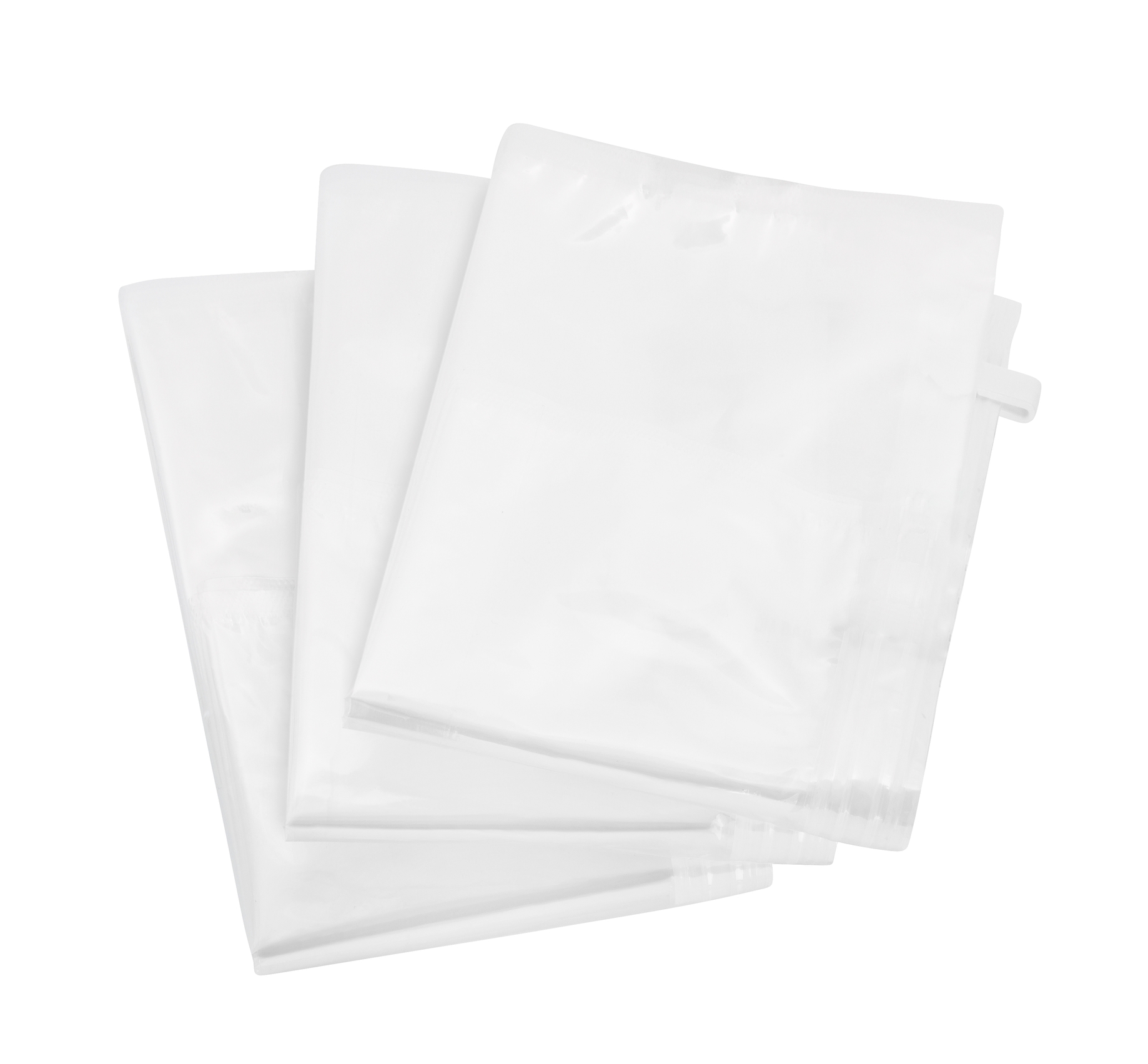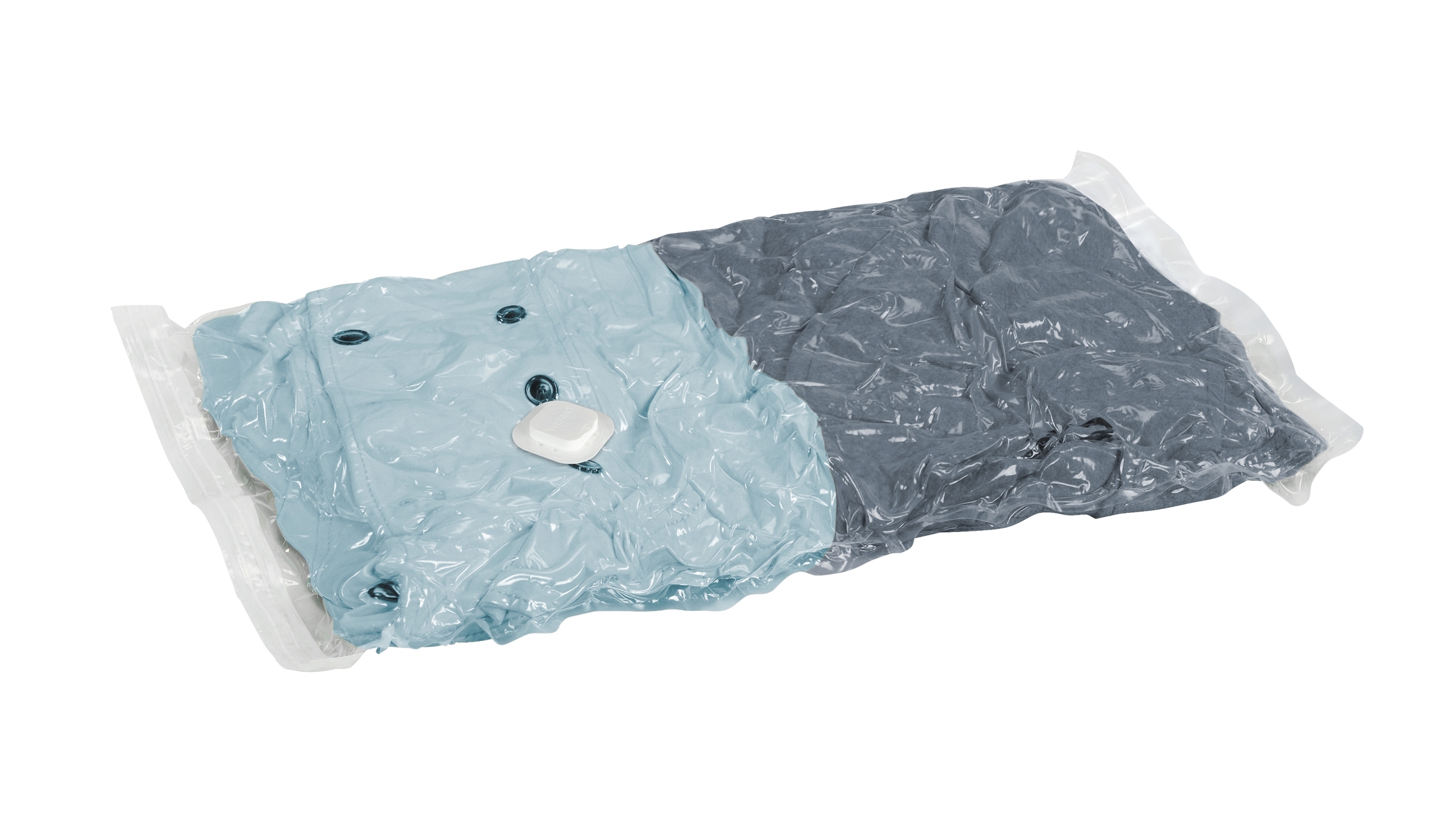 Dette sæt består af fem vakuumopbevaringsposer med flashventil til rejser samt en pumpe. Vakuumet skabes enten med støvsugeren eller den medfølgende pumpe, hvilket kan spare op til 75% plads.