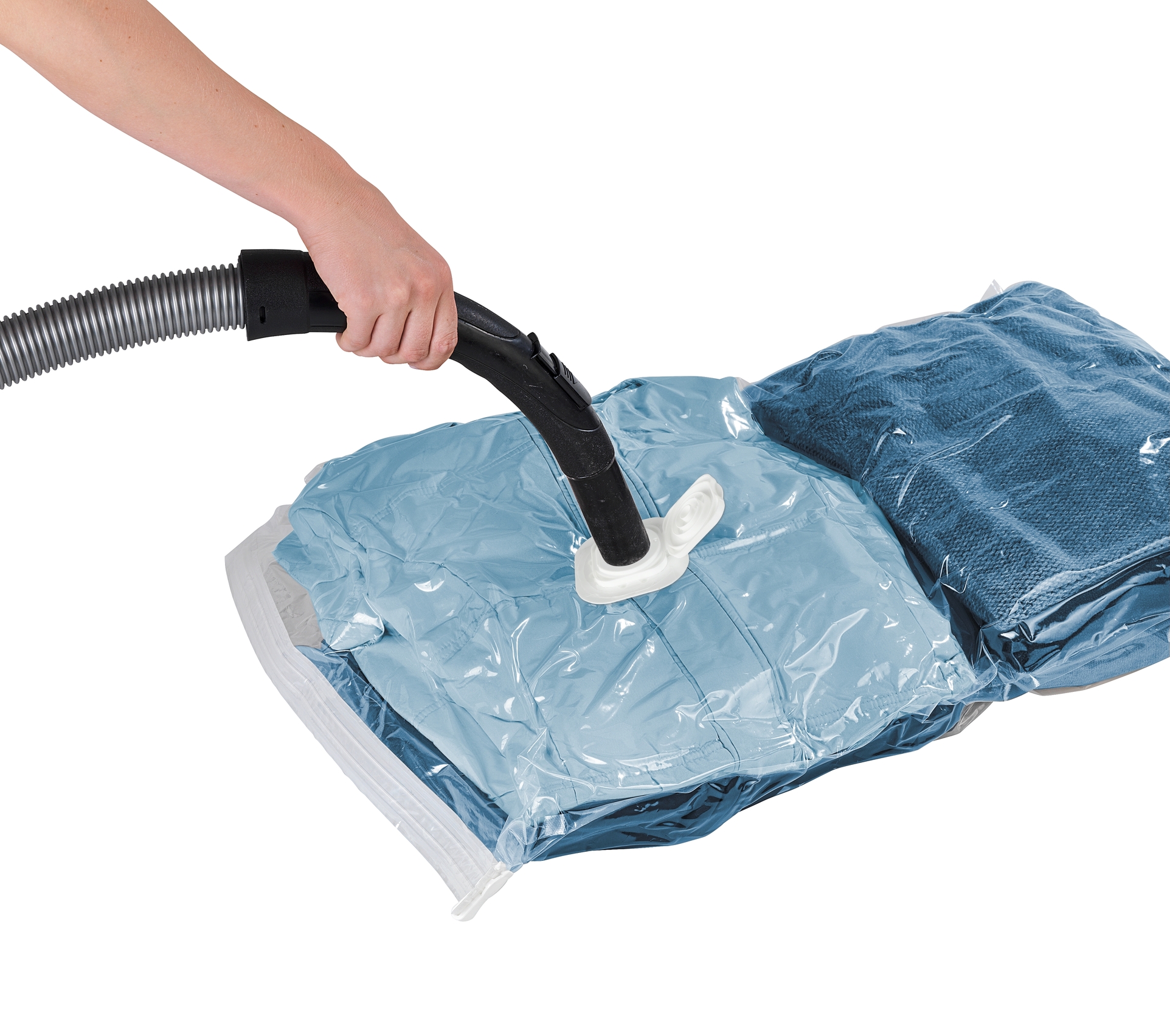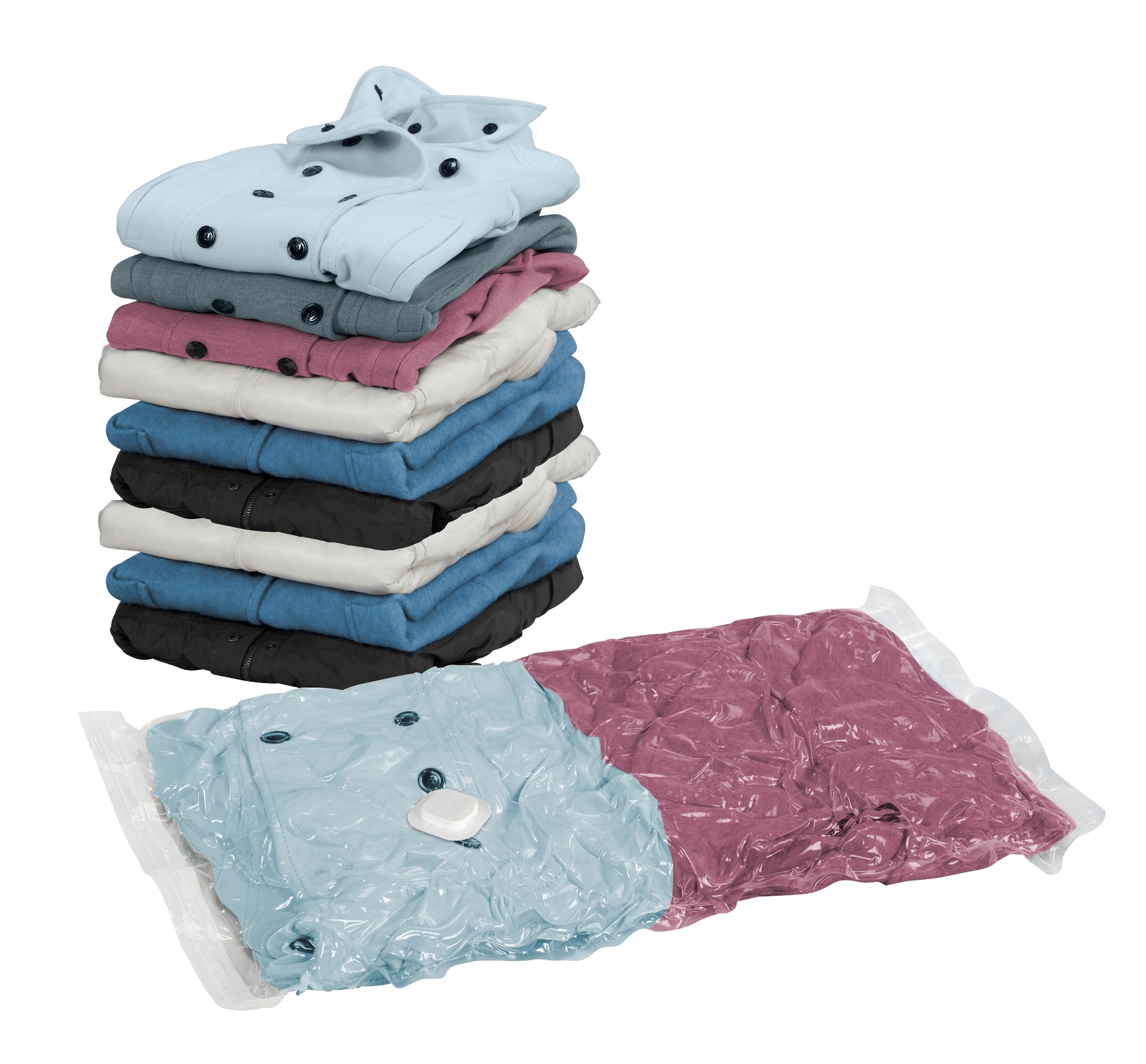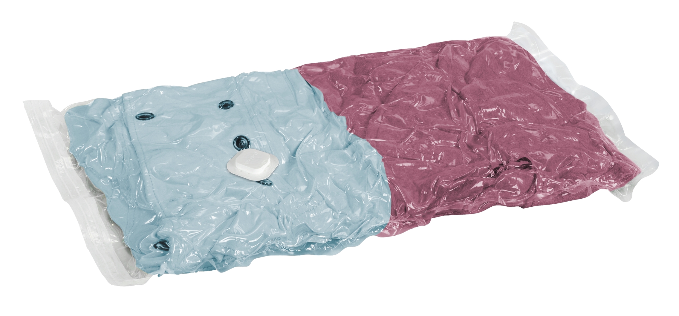 Dette sæt indeholder seks vakuumpladsbesparende poser med flashventil. Vakuumet skabes med støvsugeren, hvilket kan spare op til 75% plads. Efter brug bevarer tekstilerne deres oprindelige volumen.