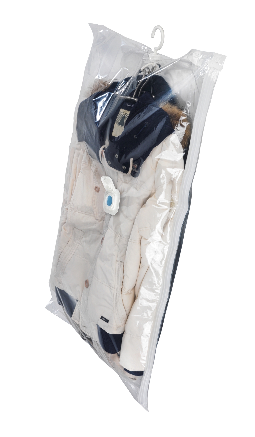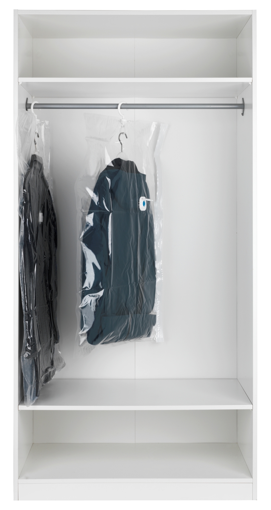 Dette vakuumklædesystem er en pladsbesparende løsning til opbevaring af flere beklædningsgenstande. Det kan spare op til 75% plads i skabet, hvilket giver dig mere plads til andre ting.