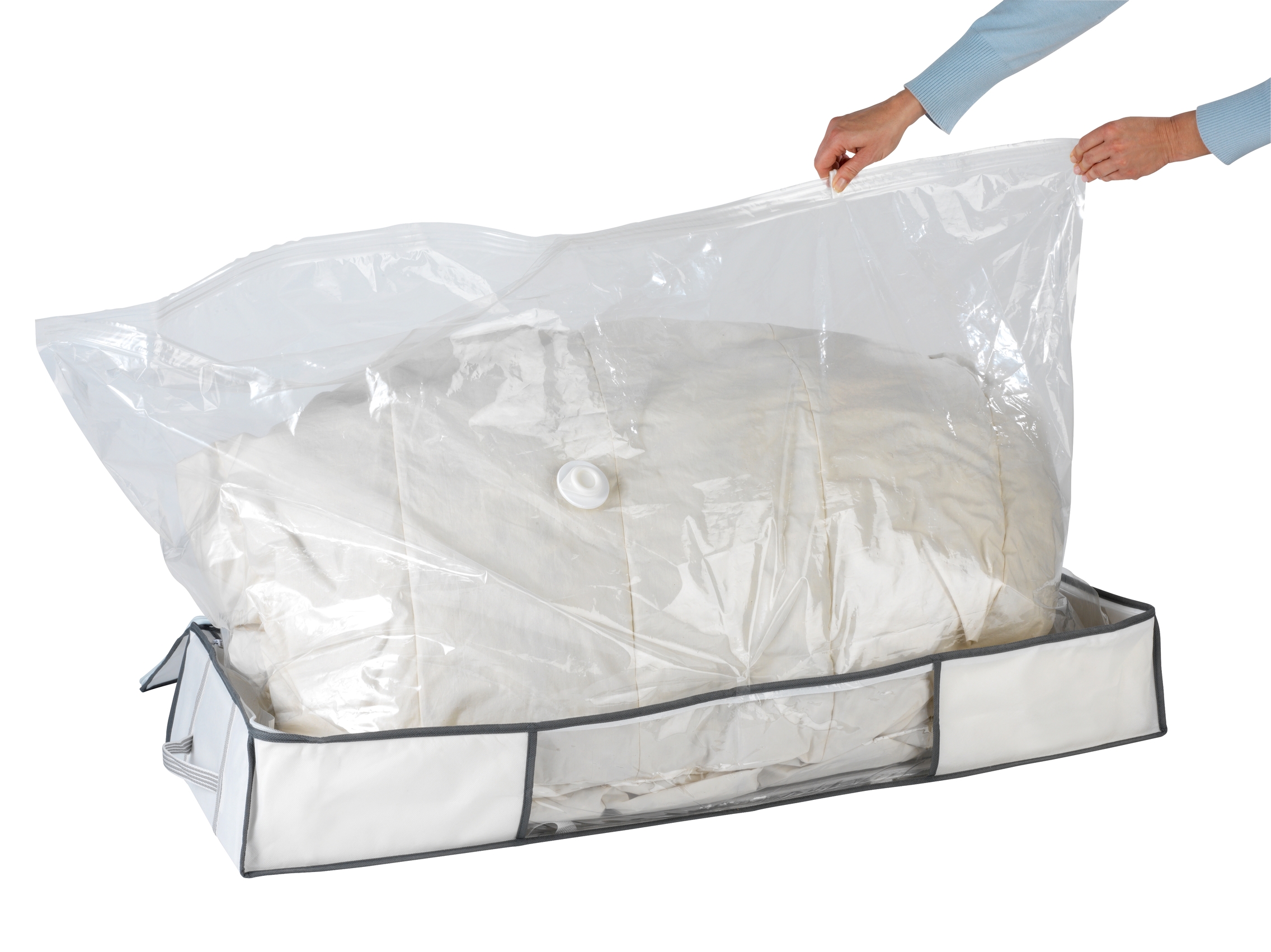 Dette vakuumopbevaringssystem tilbyder op til 75% pladsbesparelse og inkluderer en vakuumpose med dimensionerne 130 x 70 x 40 cm samt en flashventil. Det er udstyret med en luftventil, der sikrer langvarig beskyttelse af indholdet.