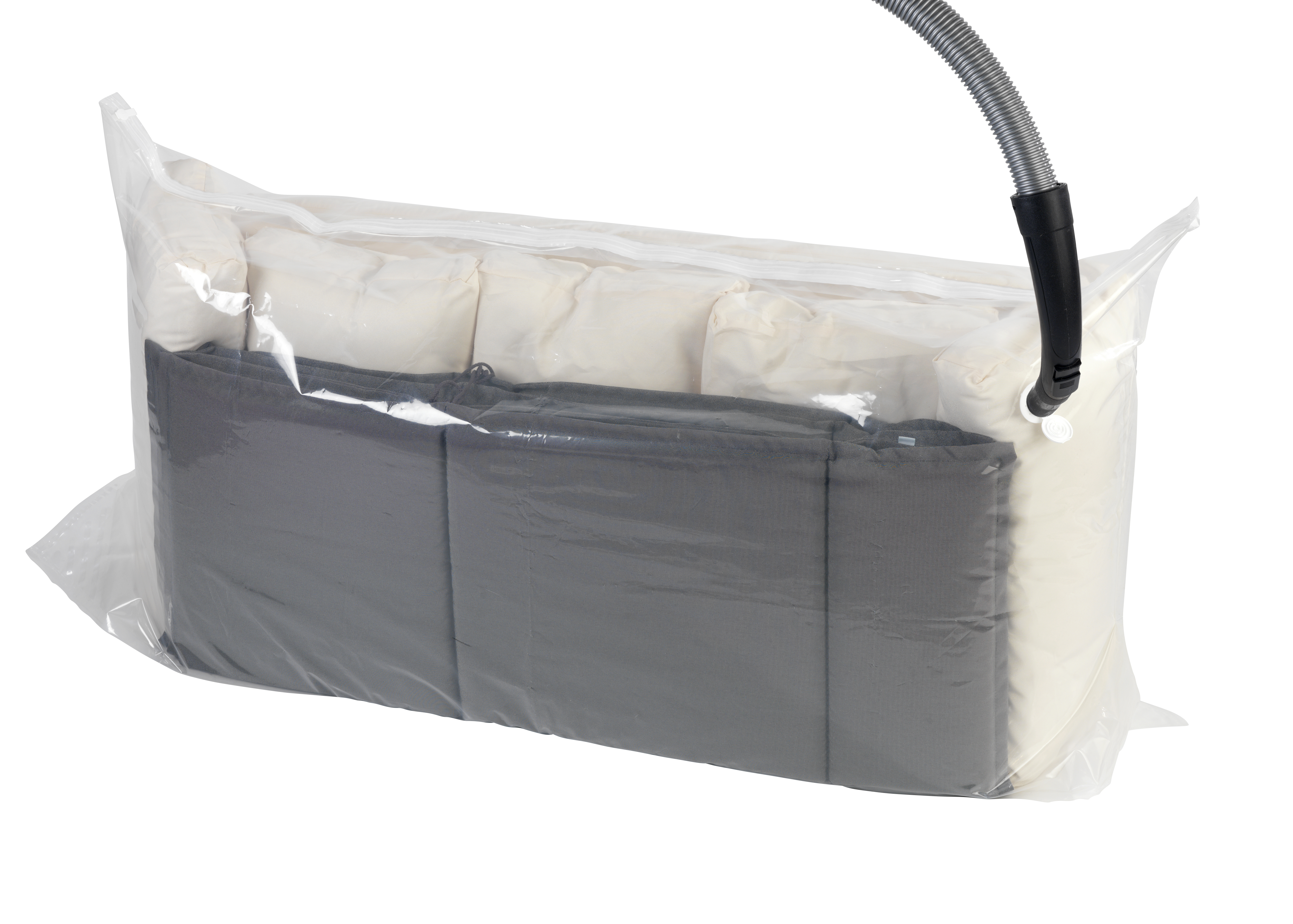 Dette praktiske vakuumopbevaringssystem sparer op til 75 % plads og er ideelt til store og voluminøse genstande som havehynder, barnevogne og lignende. Brug en støvsuger til at fjerne luften gennem lynventilen, og når posen åbnes, genvinder tekstilerne deres oprindelige volumen. Dets mål er 180 cm i bredden, 90 cm i højden og 50 cm i dybden.