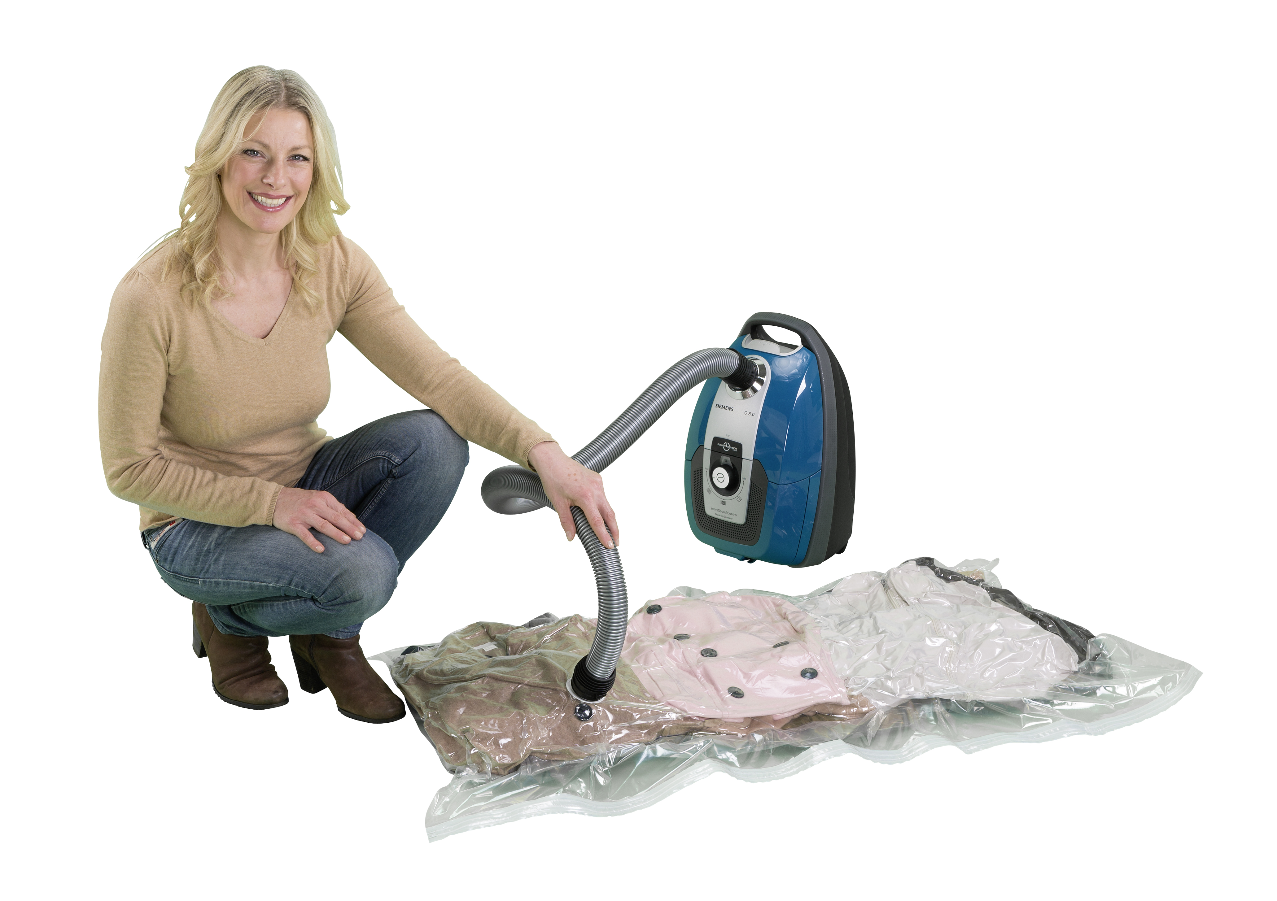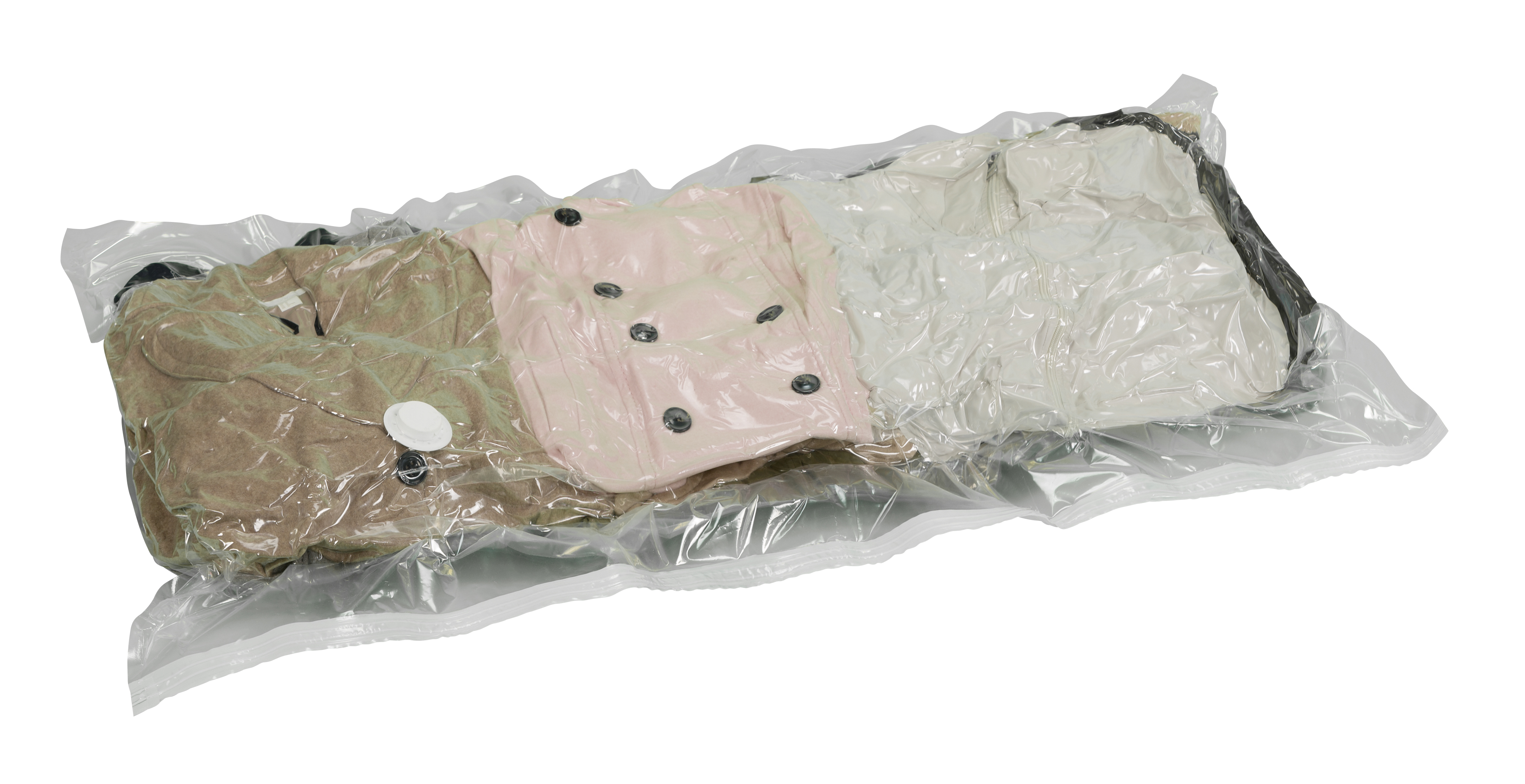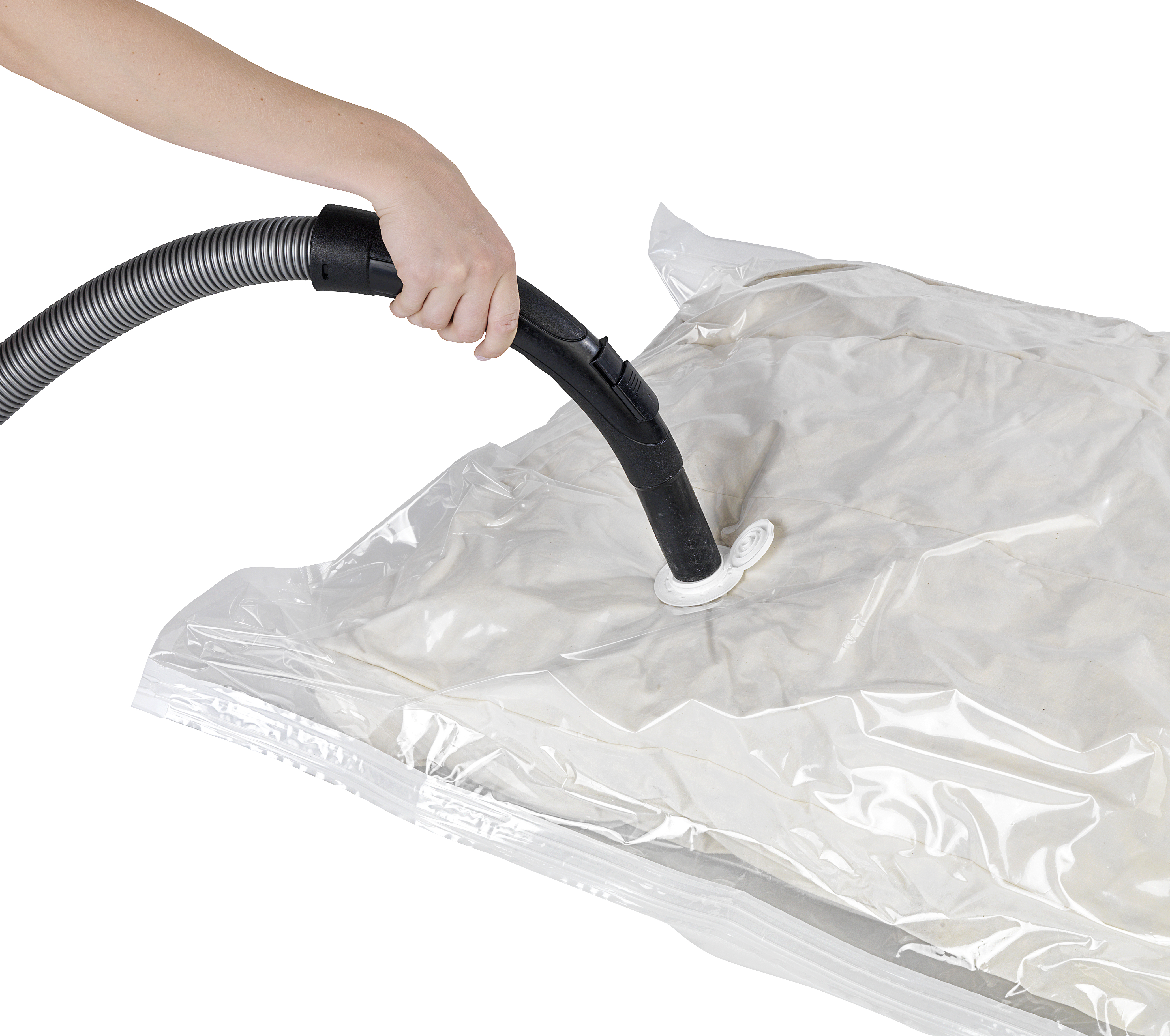 Spar op til 75 % plads ved opbevaring af tekstiler med dette vakuumopbevaringssystem. En støvsuger skaber vakuum via lynventilen, og efter brug genvinder tekstilerne deres oprindelige volumen. Posen er lavet af gennemsigtig plast og har en tilslutning til støvsugeren. Dens mål er 135 cm i bredden og 90 cm i dybden.