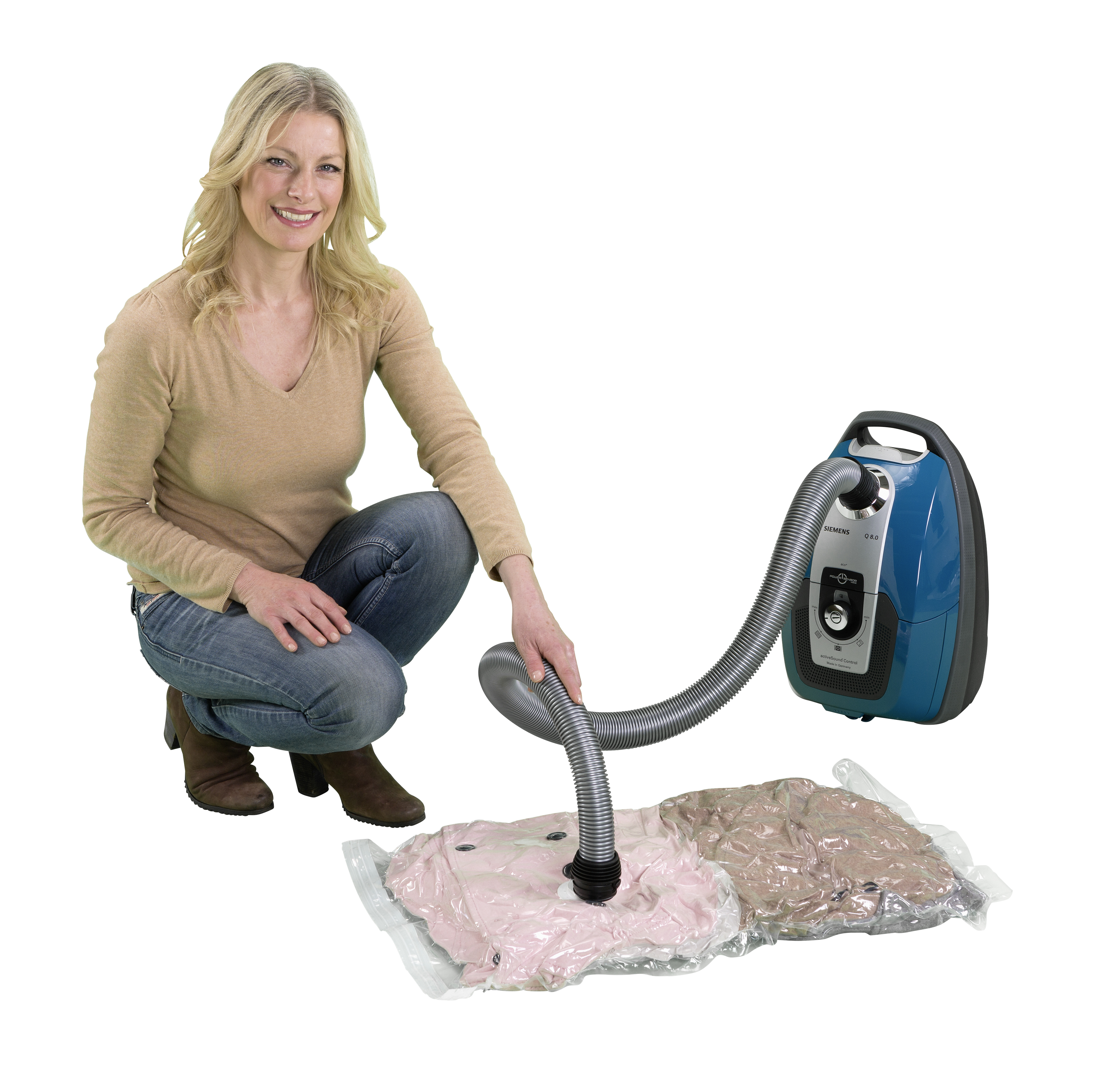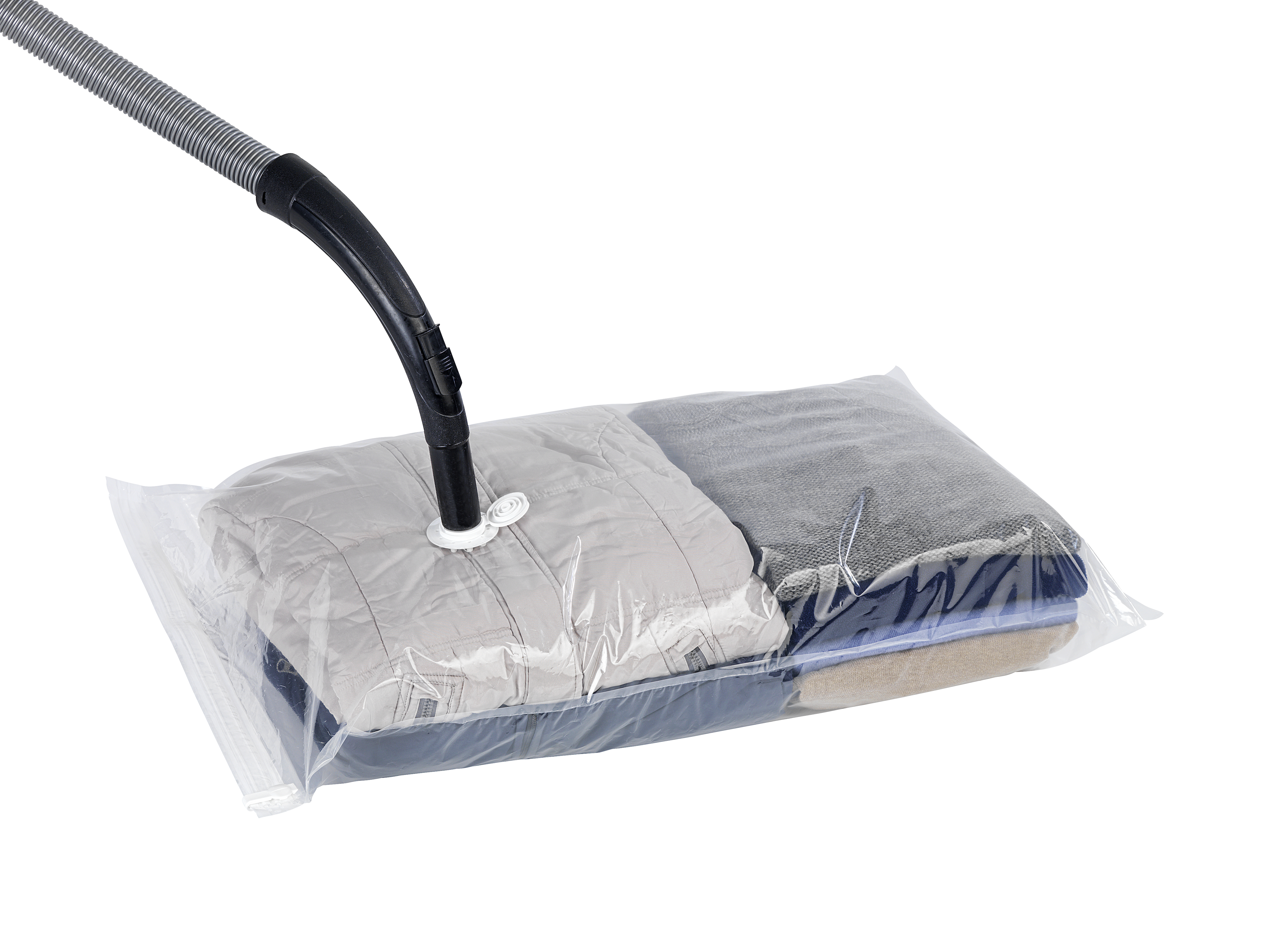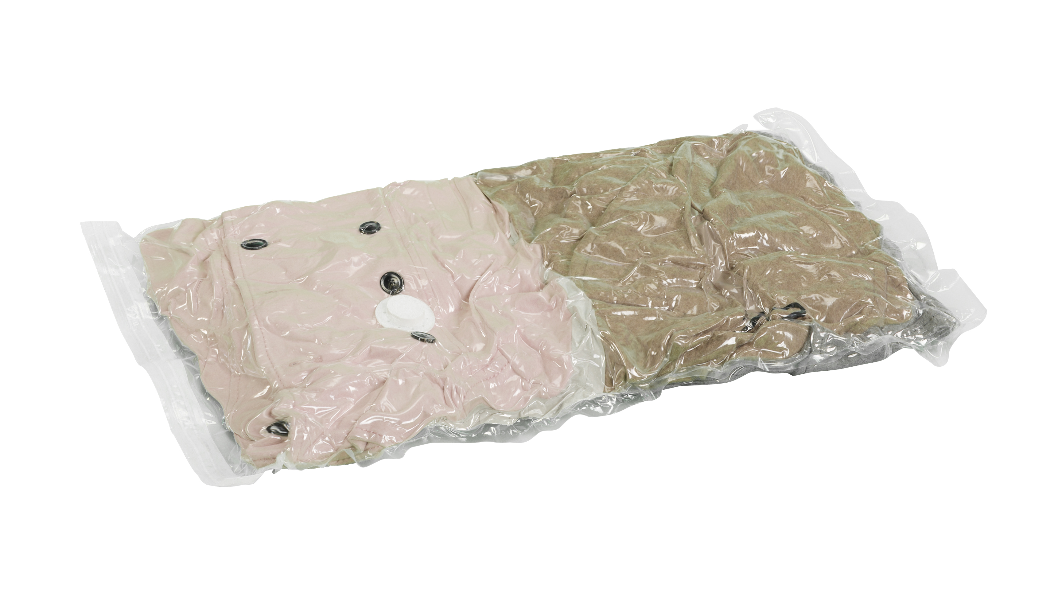 Dette sæt med to opbevaringsposer er udstyret med lynventil, der gør det muligt at skabe vakuum med en støvsuger og dermed spare op til 75 % plads. Efter brug bevarer tekstilerne deres oprindelige volumen. Poserne er fremstillet af gennemsigtig plast og har en tilslutning til støvsugeren. Hver pose måler 90 cm i bredden og 55 cm i dybden.