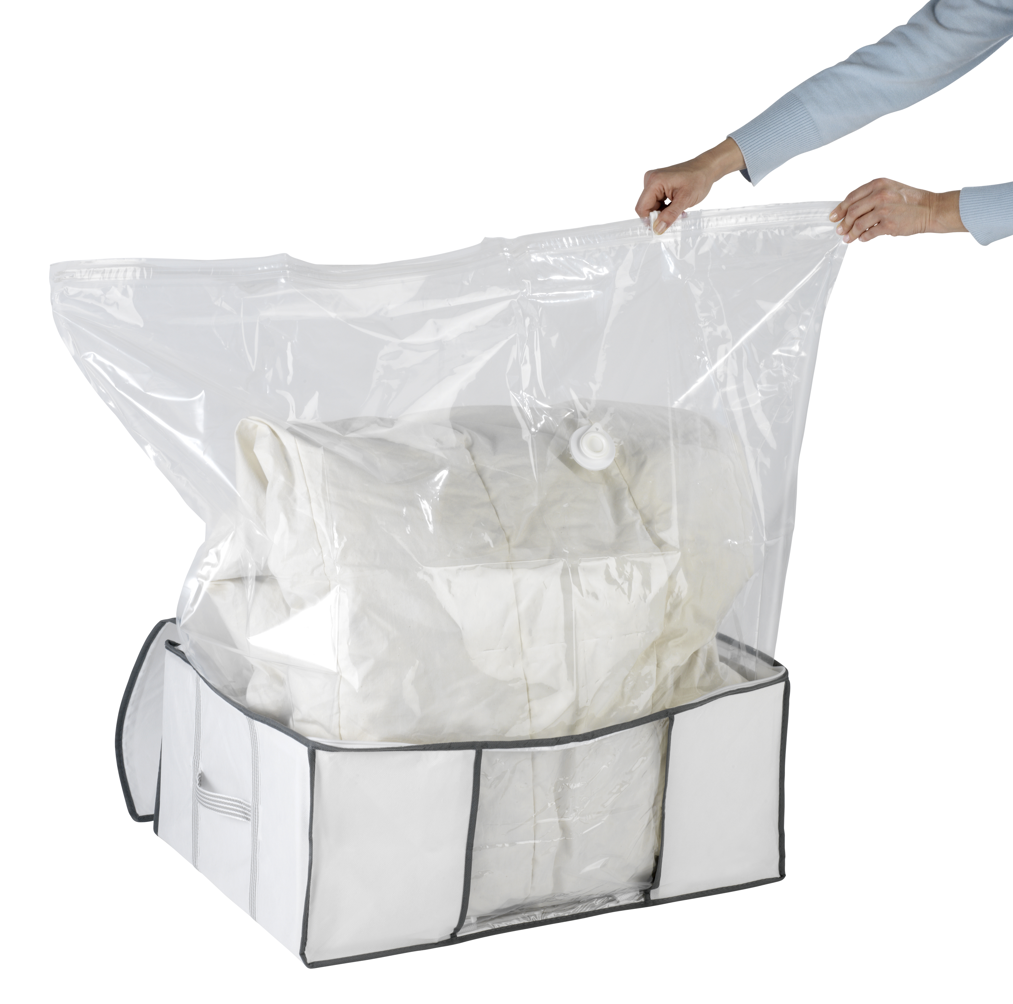 Vakuum Soft Box L kombinerer pladsbesparelse med lufttæt opbevaring. Indeni boksen findes en integreret vakuumpose (110 x 100 x 44 cm) med lynventil, som nemt lukkes ved at suge luften ud. Ventilen forhindrer luft i at trænge ind, hvilket sikrer langvarig beskyttelse. Med Vakuum Soft Box L kan du spare op til 75 % plads. Når du skal bruge tøjet igen, åbner du blot boksen, og tøjet er klar til brug.
