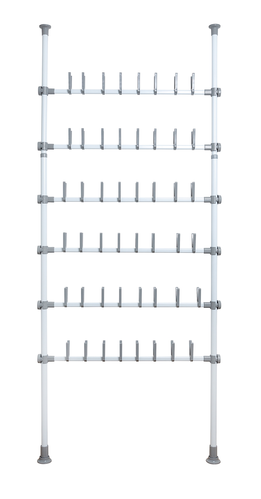 Med dette smarte teleskopsystem til skoopbevaring kan du effektivt få skoene væk fra gulvet og op på stativet. Dette skaber mere fri plads og gør det lettere at holde orden på dit fodtøj. Stativet har plads til op til 48 par sko, hvilket gør det ideelt til både den, der har en stor samling af sko, og til børnefamilier, der søger en praktisk løsning. De alsidige skoholdere kan bære alt fra stiletter til sneakers, så hele familien kan få glæde af systemet. Monteringen er nem, da systemet ikke kræver boring, hvilket gør installationen hurtig og problemfri.
