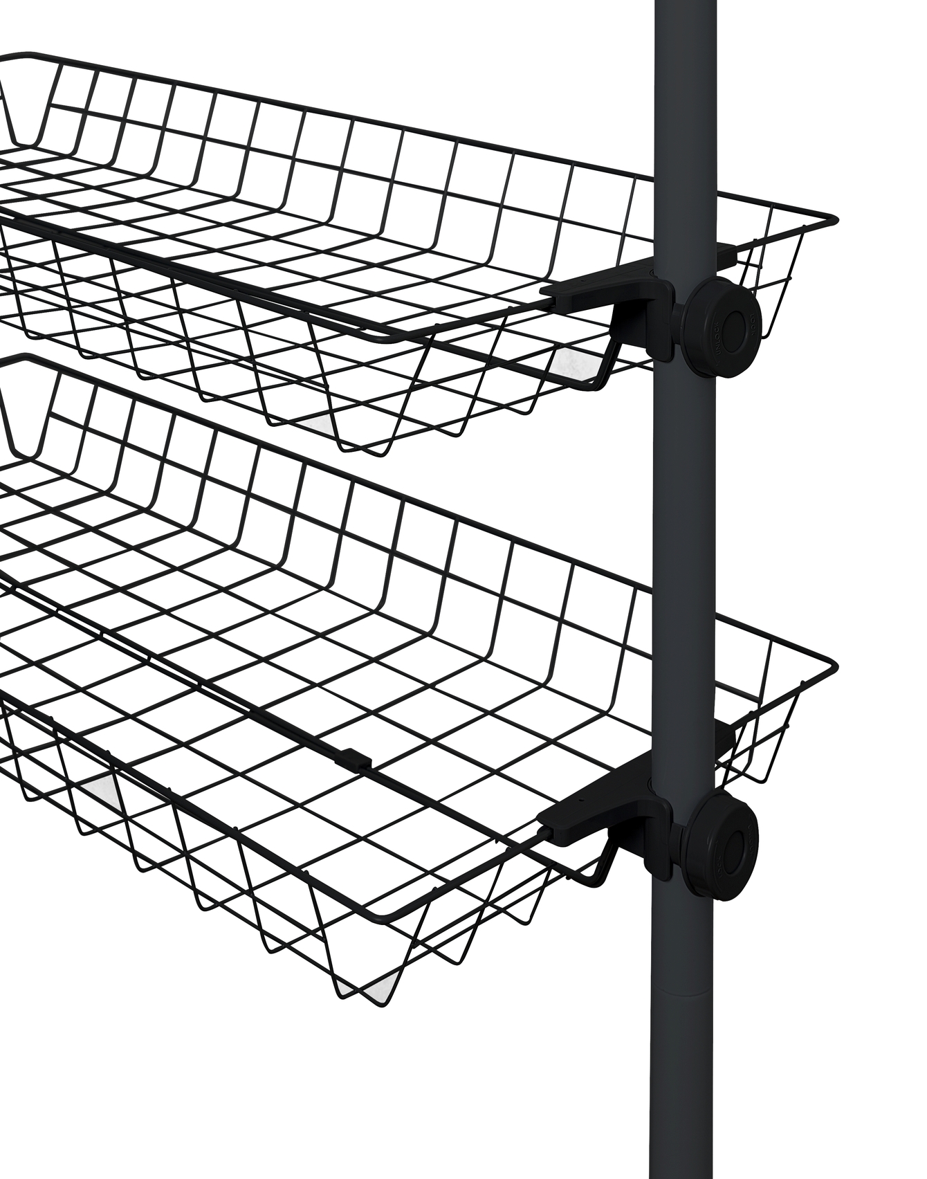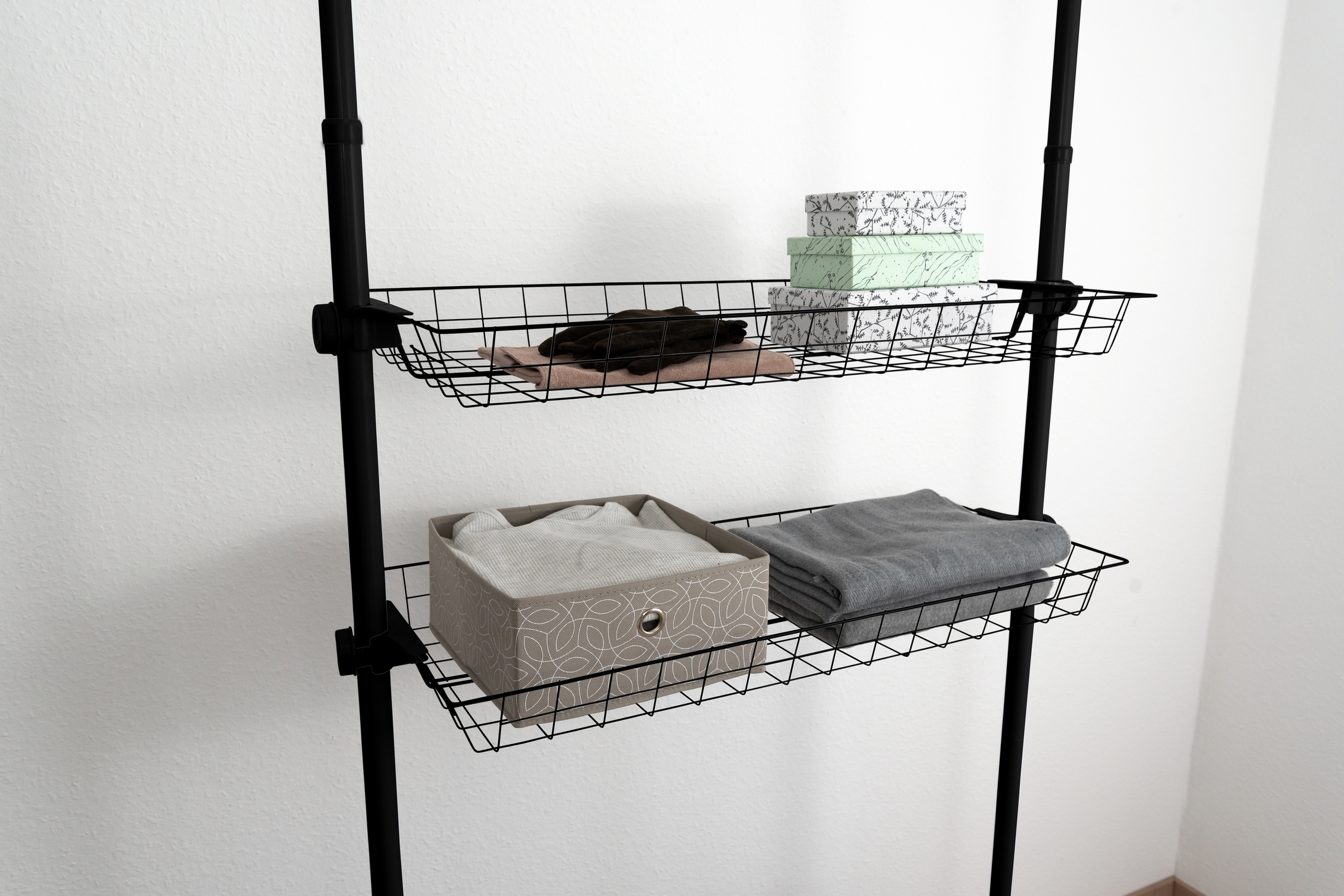 De rummelige kurve er lavet af robust stål med trendy sort tråddesign og monteres nemt uden boring ved hjælp af medfølgende plastikbeslag. Kurvene måler 83 x 8 x 38 cm (B x H x D) uden beslag og kan bære op til 15 kg. Med beslag er bredden 94 cm. De store trådkurve er ideelle til at opbevare tøj, der ikke hænges på bøjler, men foldes, og kan også bruges til opbevaringsbokse til småting som sokker eller bælter, hvilket giver systemet et personligt præg. Opfyld drømmen om en walk-in garderobe med WENKOs Herkules teleskopsystem og vælg tilbehør, der passer til dig. Foretrækker du en lysere indretning, findes systemet også i hvid med lysegrå beslag.