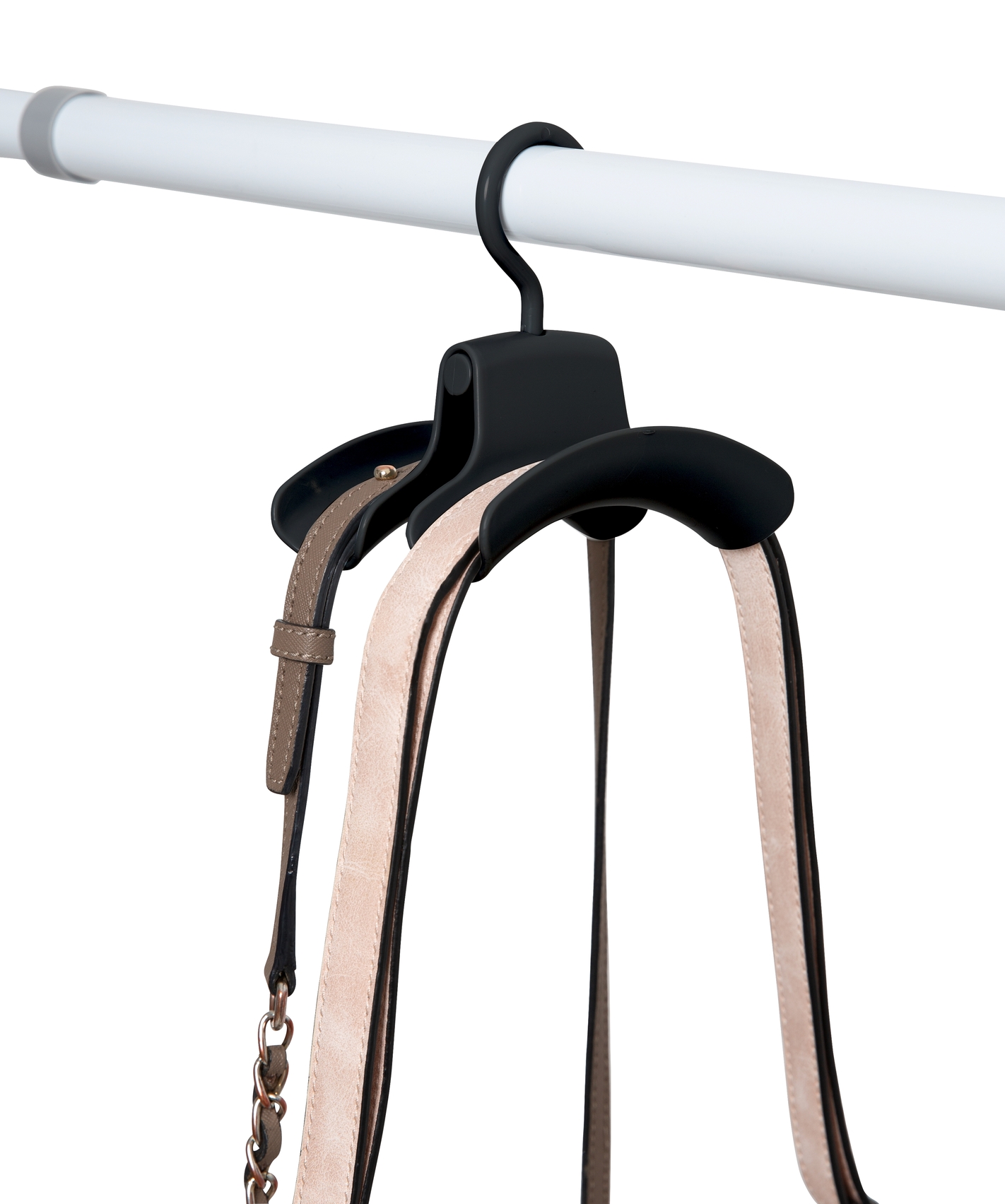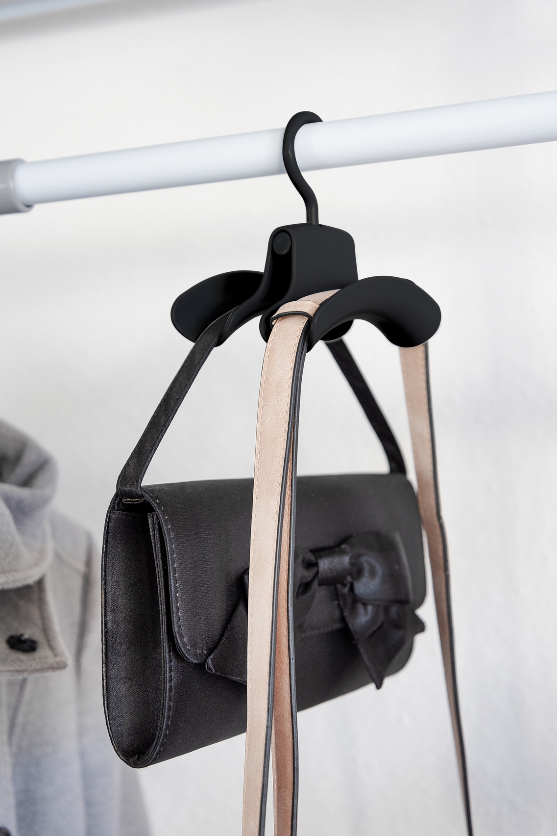Med WENKOs fleksible teleskopsystem Herkules kan drømmen om en walk-in garderobe gå i opfyldelse i næsten alle rum. Den sorte Herkules håndtaskebøjle er det perfekte supplement til dig, der ønsker at opbevare dine tasker overskueligt og organiseret. Den passer perfekt på teleskopstængerne i systemet. De ekstra brede flader kan holde to tasker eller rygsække hver. Sættet leveres i en praktisk 3-pak, så du kan hænge op til 6 tasker på én gang. Håndtaskebøjlen sparer plads og beskytter samtidig dine tasker.