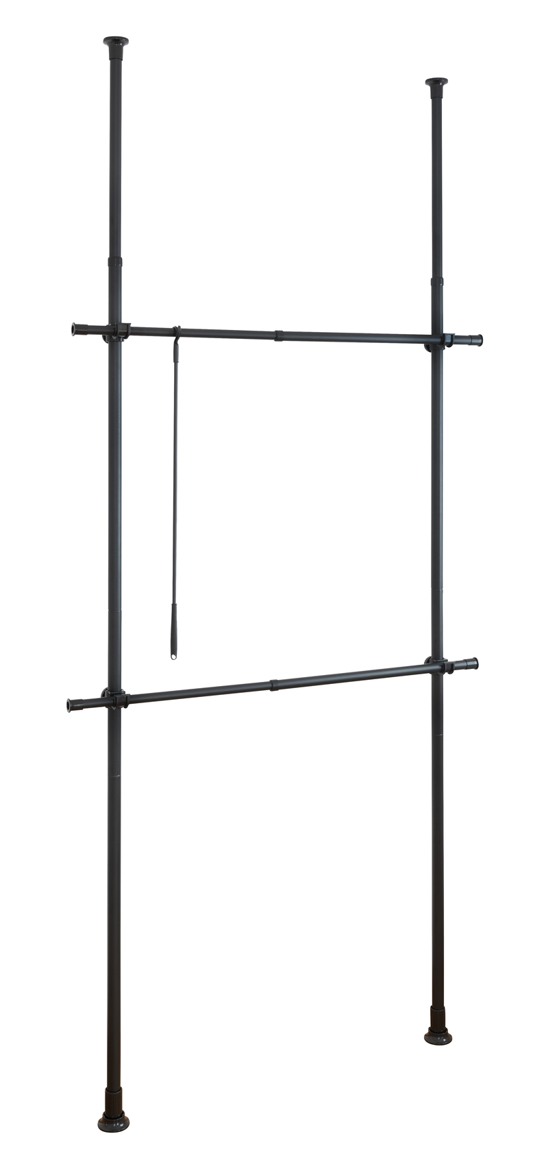 Det er nemt at samle takket være det praktiske klemmesystem, der ikke kræver boring eller skruer. Dimensionerne er 75-120 cm i bredden, 165-300 cm i højden og 11 cm i dybden, og det inkluderer to støttestænger, to tøjstænger og en tøjkrog. Dette system er ideelt til at holde dit tøj organiseret og let tilgængeligt.
