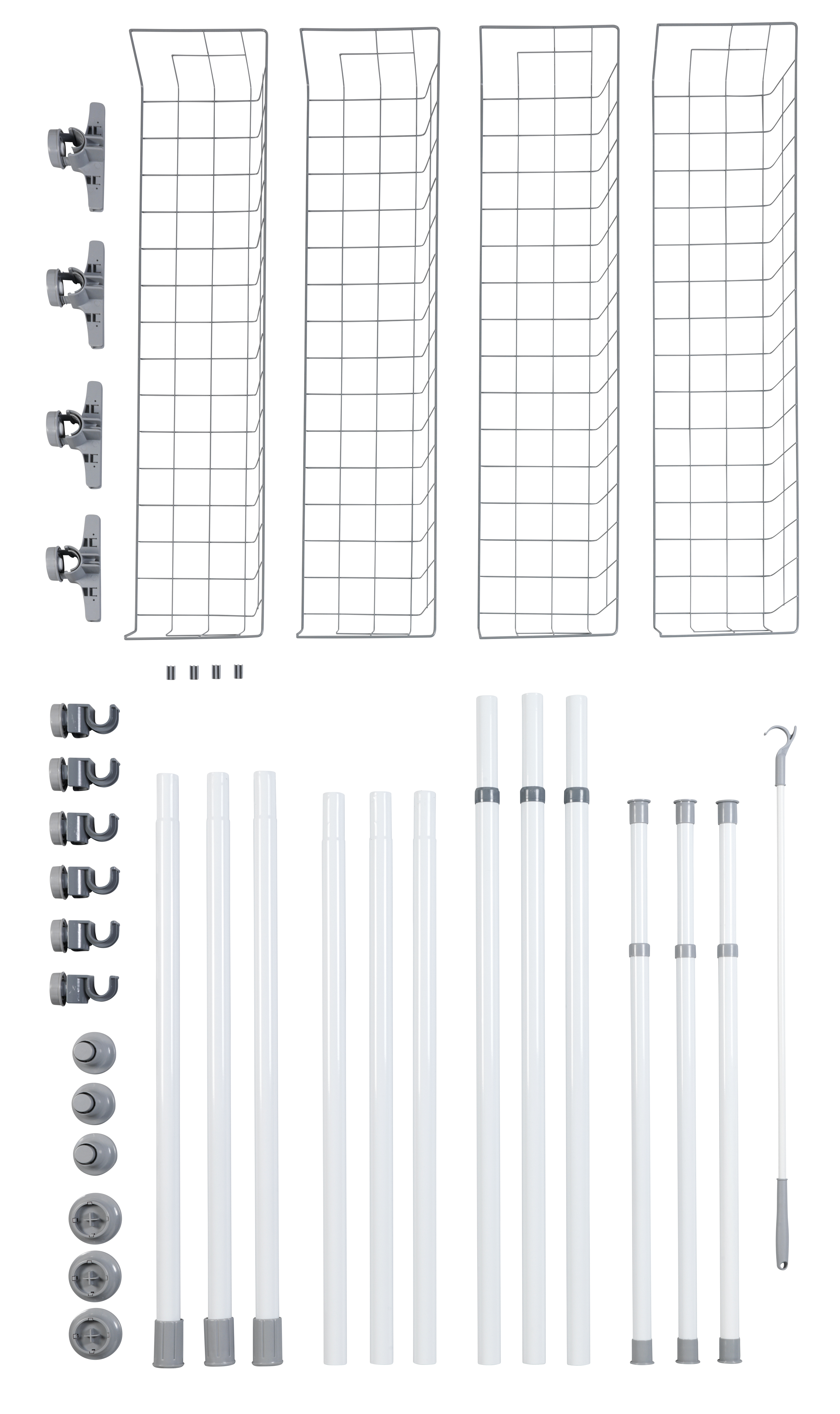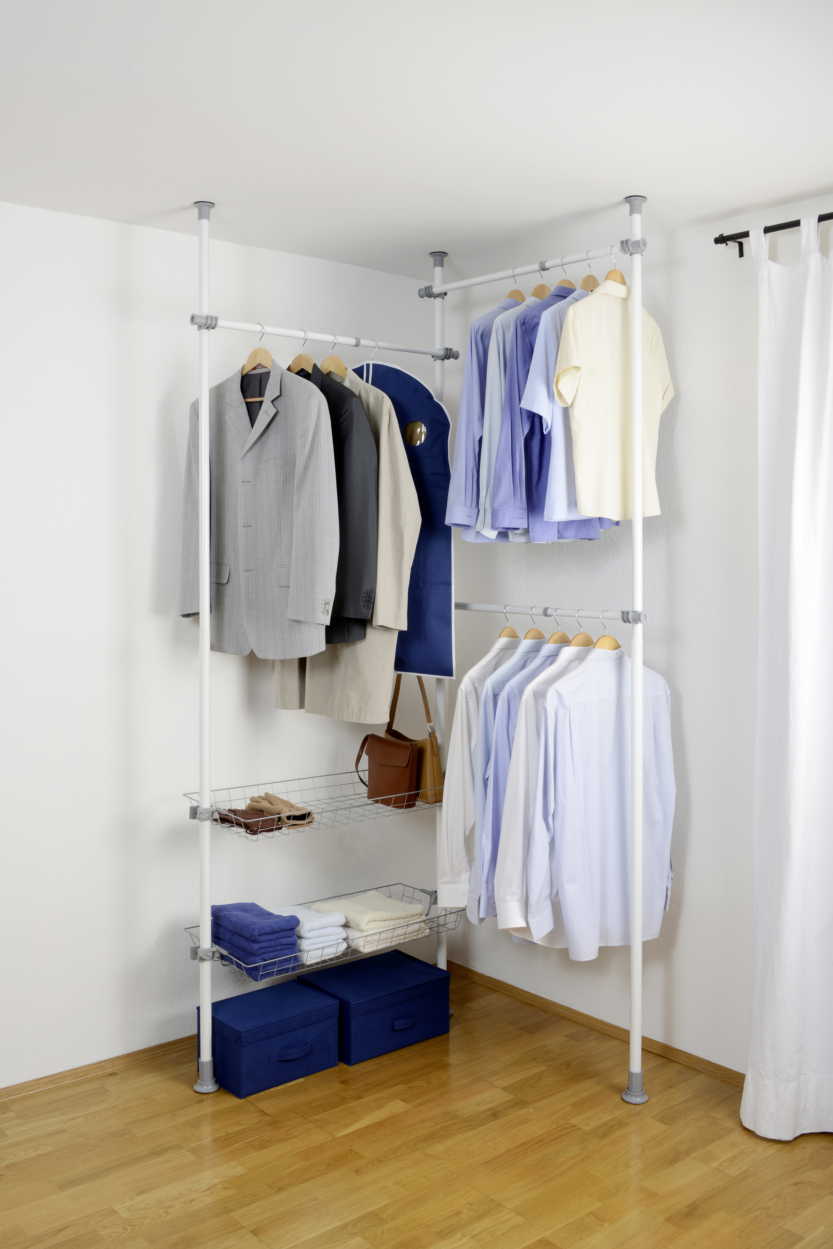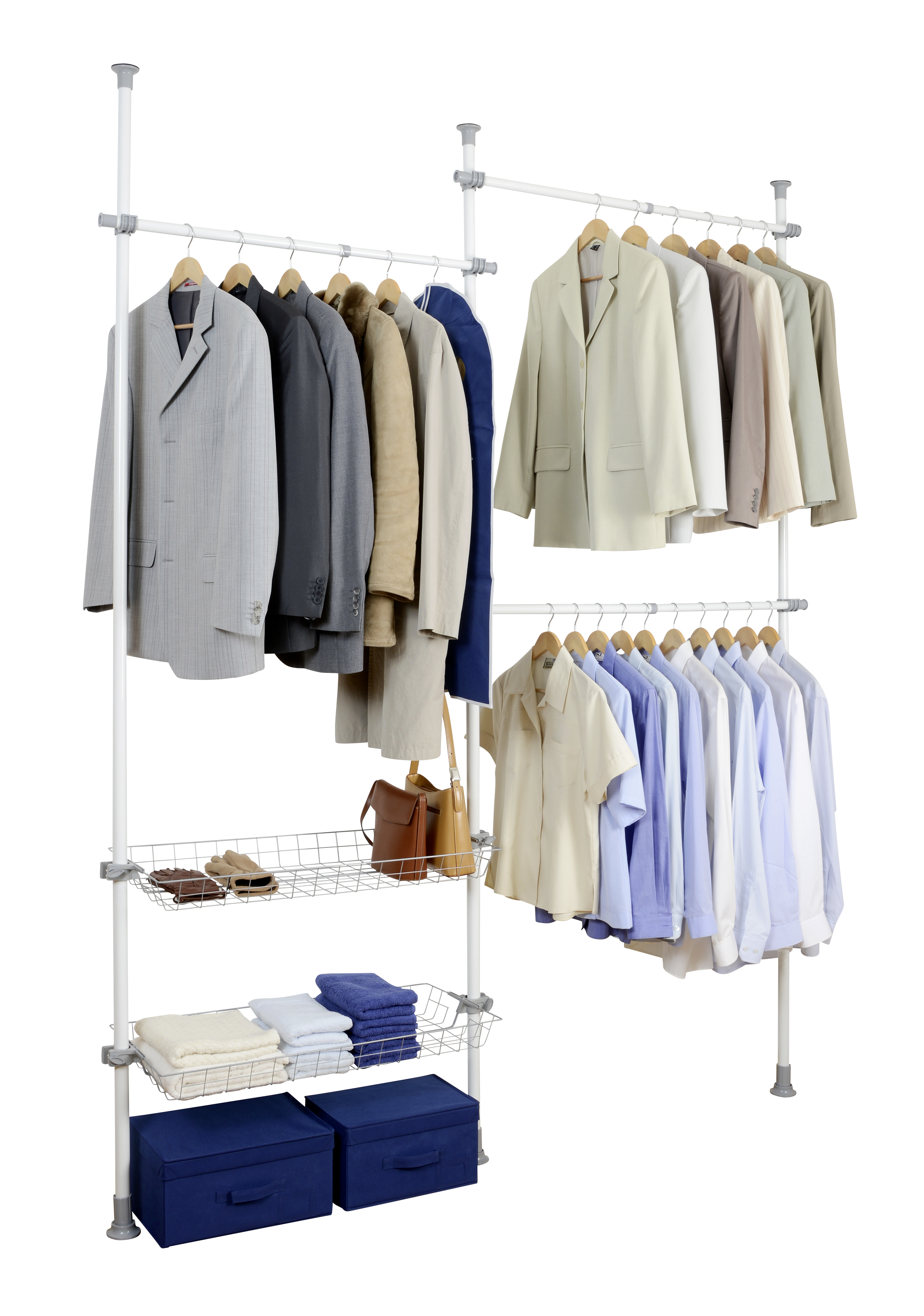 Dette individuelt justerbare organisering system kan let klemmes mellem gulv og loft. Det har tre højdejusterbare tøjstænger, der kan tilpasses uendeligt. Systemet inkluderer også to justerbare opbevaringskurve og en hængeanordning.
