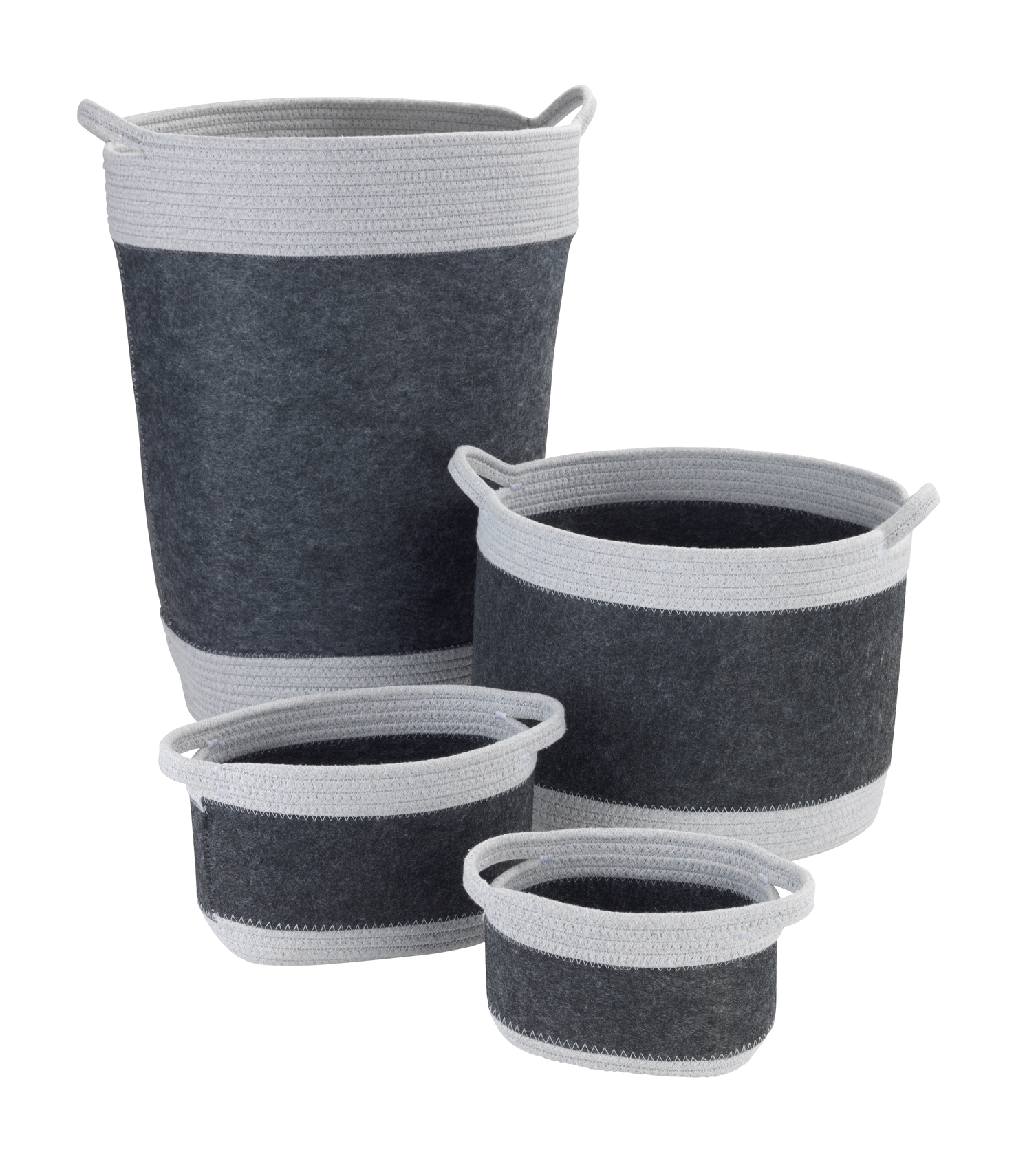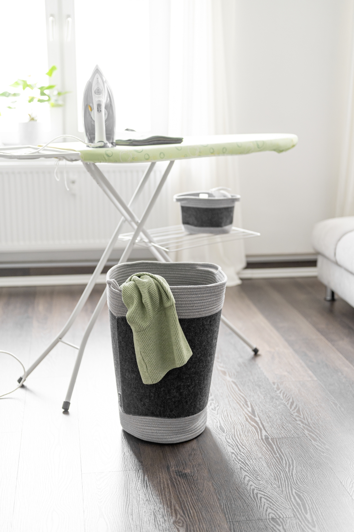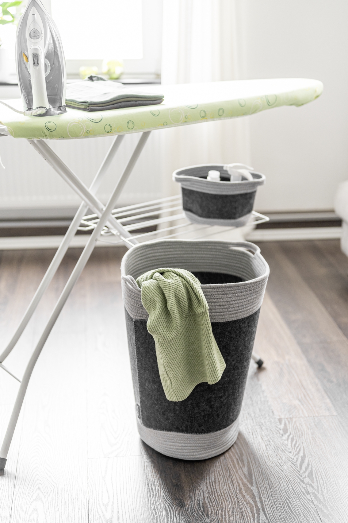 Bea-serien fra WENKO tilbyder praktiske løsninger til hjemmet. Den dekorative filtvasketøjskurv giver dit beskidte tøj et elegant sted at vente på næste vask. Den stilfulde kurv i mørkegrå har både bund og kant i et flot flettemønster lavet af 80 % lysgrå bomuld og 20 % polyester. Det tætvævede design fortsætter i de to praktiske håndtag, som kurven er udstyret med.