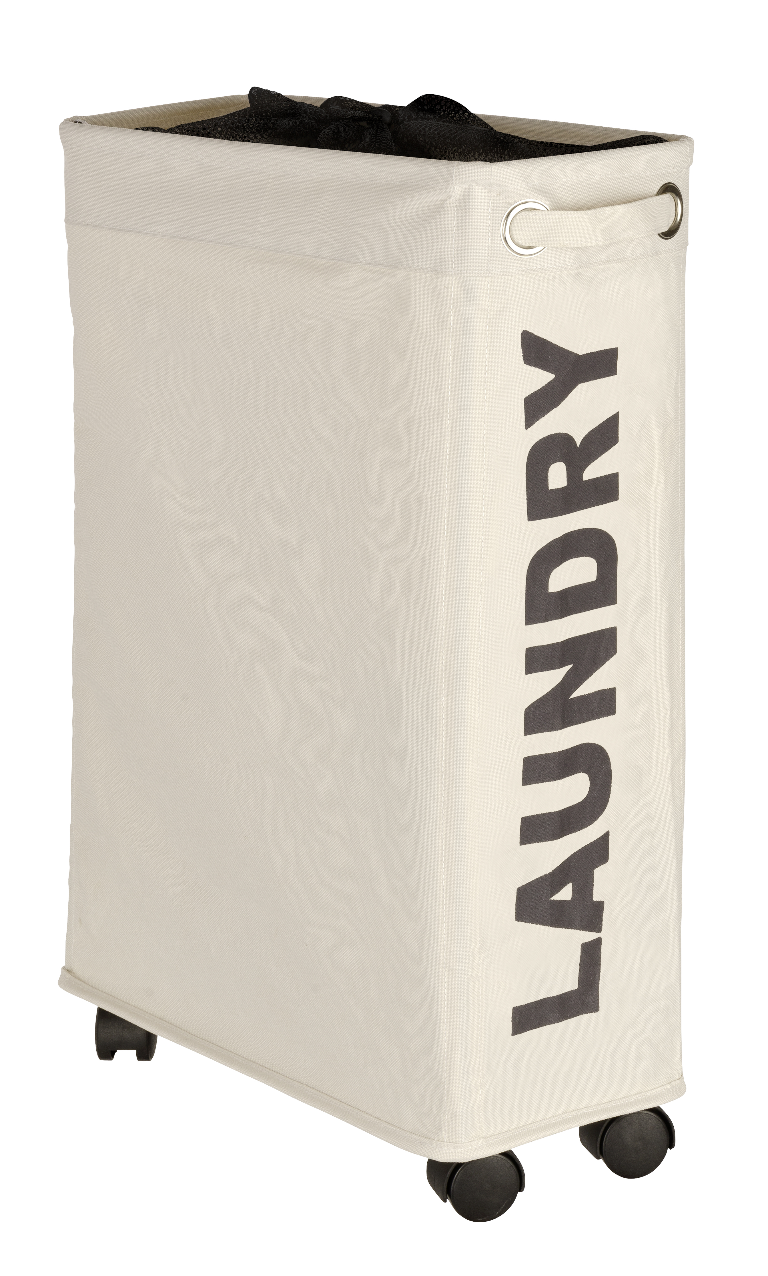Moderne vasketøjskurv i beige stof med ordet ”LAUNDRY” trykt lodret i mørke bogstaver. Vasketøjskurven har en kapacitet på 43 liter, og den har praktiske bærehåndtag. Beholderen er udstyret med 4 hjul, så den nemt og fleksibelt kan flyttes rundt og placeres efter ønske.