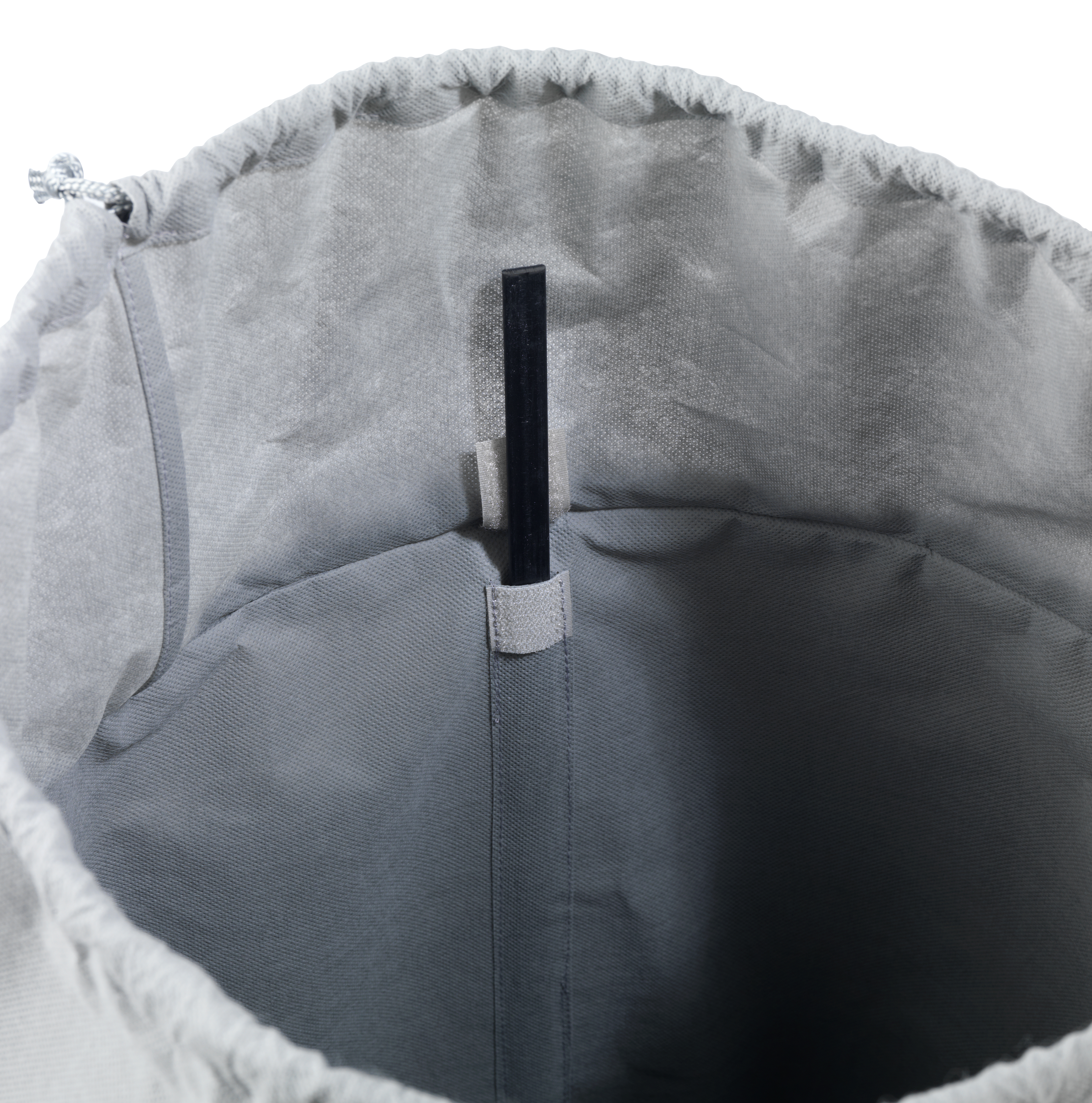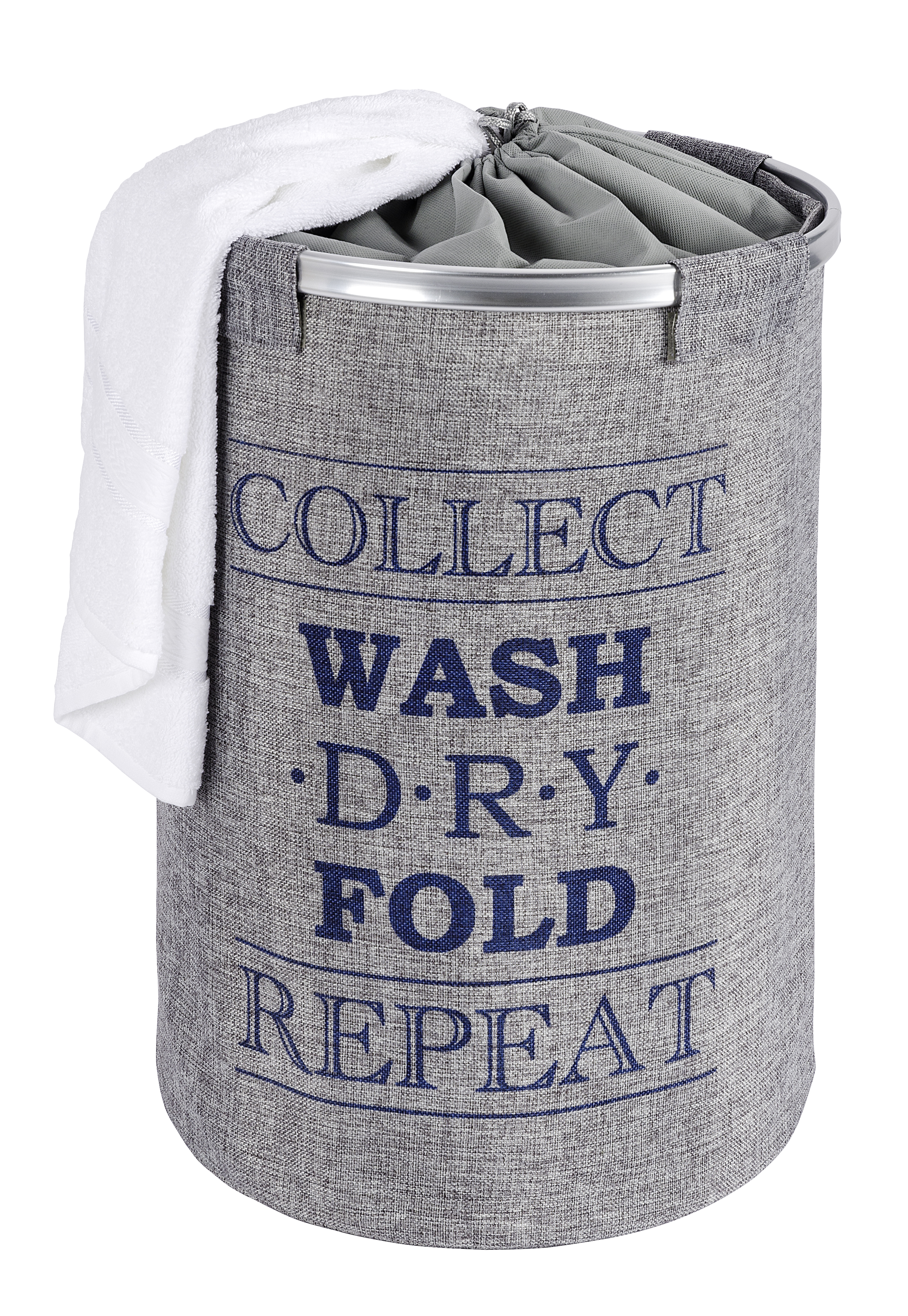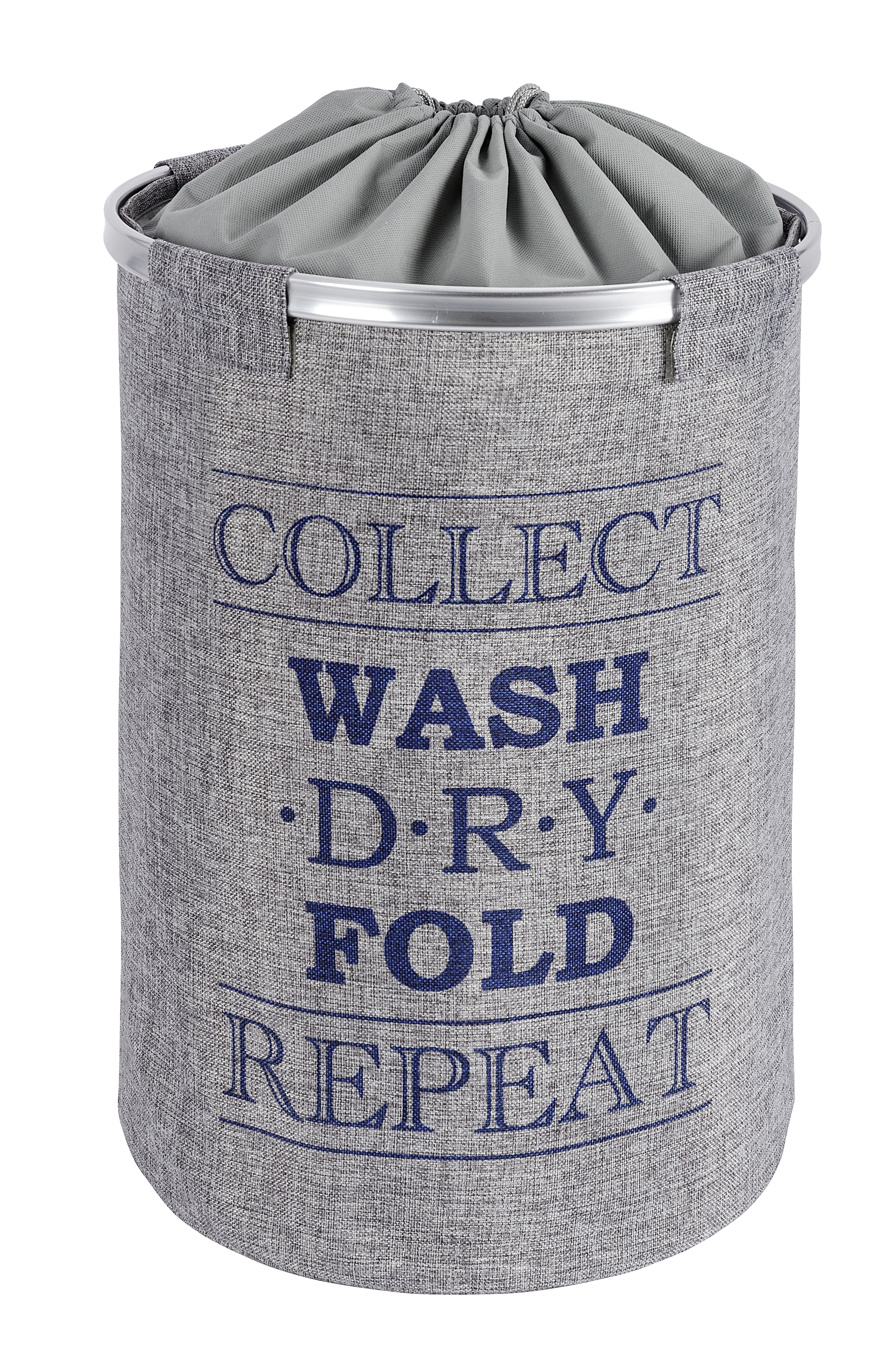 Denne smarte vasketøjskurv er lavet af polyester og aluminium. Vasketøjsstativet er i gråt stof med blå bogstaver, hvor der står ”COLLECT”, ”WASH”, ”DRY”, ”FOLD”, ”REPEAT”. Beholderen har en kapacitet på 68 liter, og den kan lukkes til ved at trække i snoren