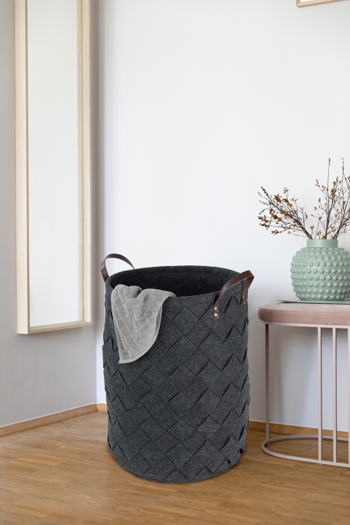 Denne rummelige vasketøjsbin er designet til at være foldbar, hvilket sparer plads, når den ikke er i brug. Den har to håndtag i imiteret læder, der gør det nemt at transportere den. Kurven har et vævet filtlook i trendy antracit, der giver et moderne udseende.