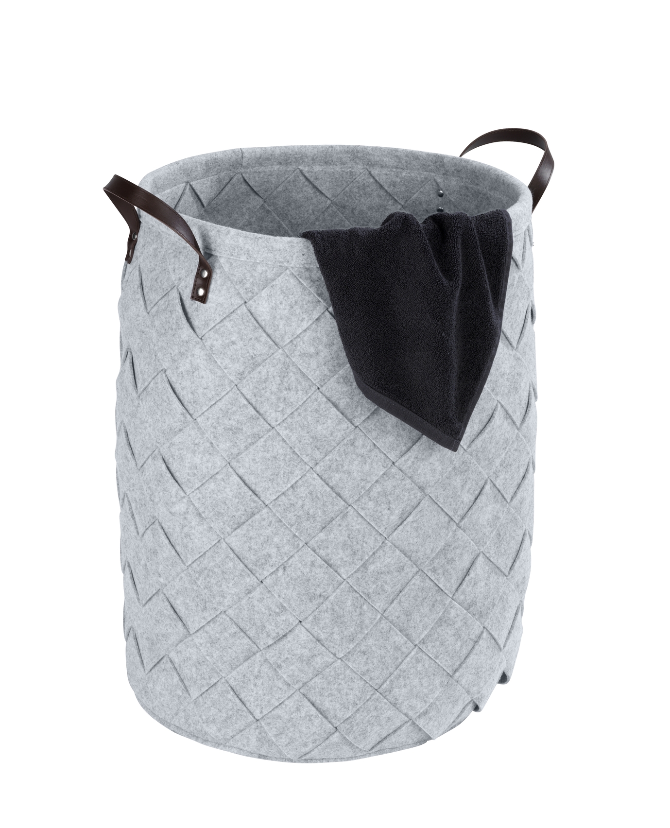 Denne rummelige vasketøjskurv er designet til at være foldbar, hvilket sparer plads, når den ikke er i brug. Den har to håndtag i imiteret læder, der gør det nemt at transportere den. Kurven har et vævet filtlook i trendy grå, der giver et stilfuldt udseende.