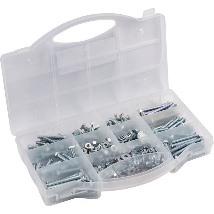 Sortimentkassen indeholder 420 dele, herunder sæt skruer, møtrikker og store diameter skiver, alle i henhold til DIN standarder. Der er sæt skruer (DIN 933) i størrelserne: 20 stk. M5 x 20 mm, 20 stk. M5 x 30 mm, 20 stk. M5 x 40 mm, 20 stk. M5 x 50 mm, 15 stk. M6 x 20 mm, 15 stk. M6 x 30 mm, 15 stk. M6 x 40 mm og 15 stk. M6 x 50 mm.