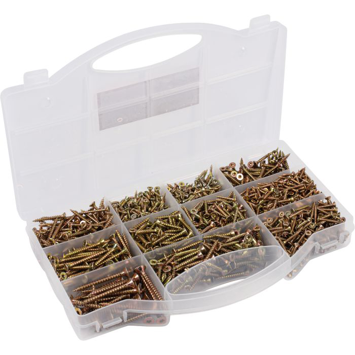 Sortimentkassen indeholder 1700 universalskruer med TX-drev og forsænket hoved, alle med anti-friktion belægning og zinkbelægning. Der er skruer i følgende størrelser: 450 stk. 3,0 x 12 mm, 350 stk. 3,0 x 16 mm, 250 stk. 3,0 x 20 mm, 150 stk. 3,5 x 20 mm, 100 stk. 3,5 x 25 mm, 100 stk. 3,5 x 30 mm, 100 stk. 4,0 x 25 mm, 100 stk. 4,0 x 30 mm, 70 stk. 4,0 x 40 mm og 30 stk. 5,0 x 50 mm. Alle skruerne opbevares i en praktisk plastikæske med gennemsigtigt låg for god oversigt.