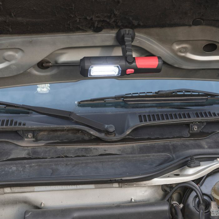 Denne praktiske lampe kombinerer COB hovedlys og en ekstra LED-lommelygte for maksimal belysning. Udstyret med en drejelig krog og magnet på undersiden, så den nemt kan fastgøres til metalgenstande. Med lang levetid takket være minimalt strømforbrug og et håndvenligt design er den ideel til både arbejdet og fritiden. Inkluderer 3 stk. AA 1,5 V batterier.