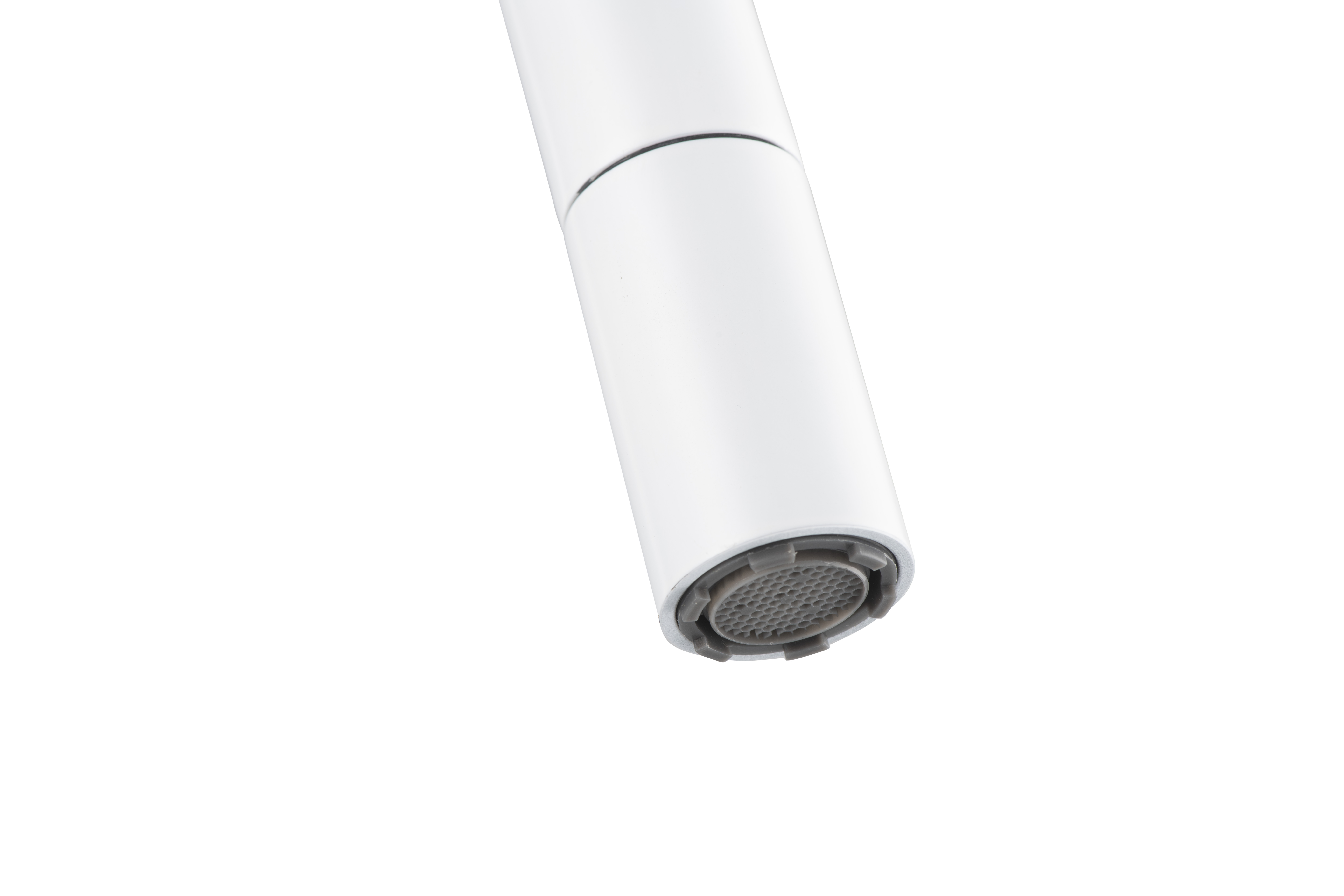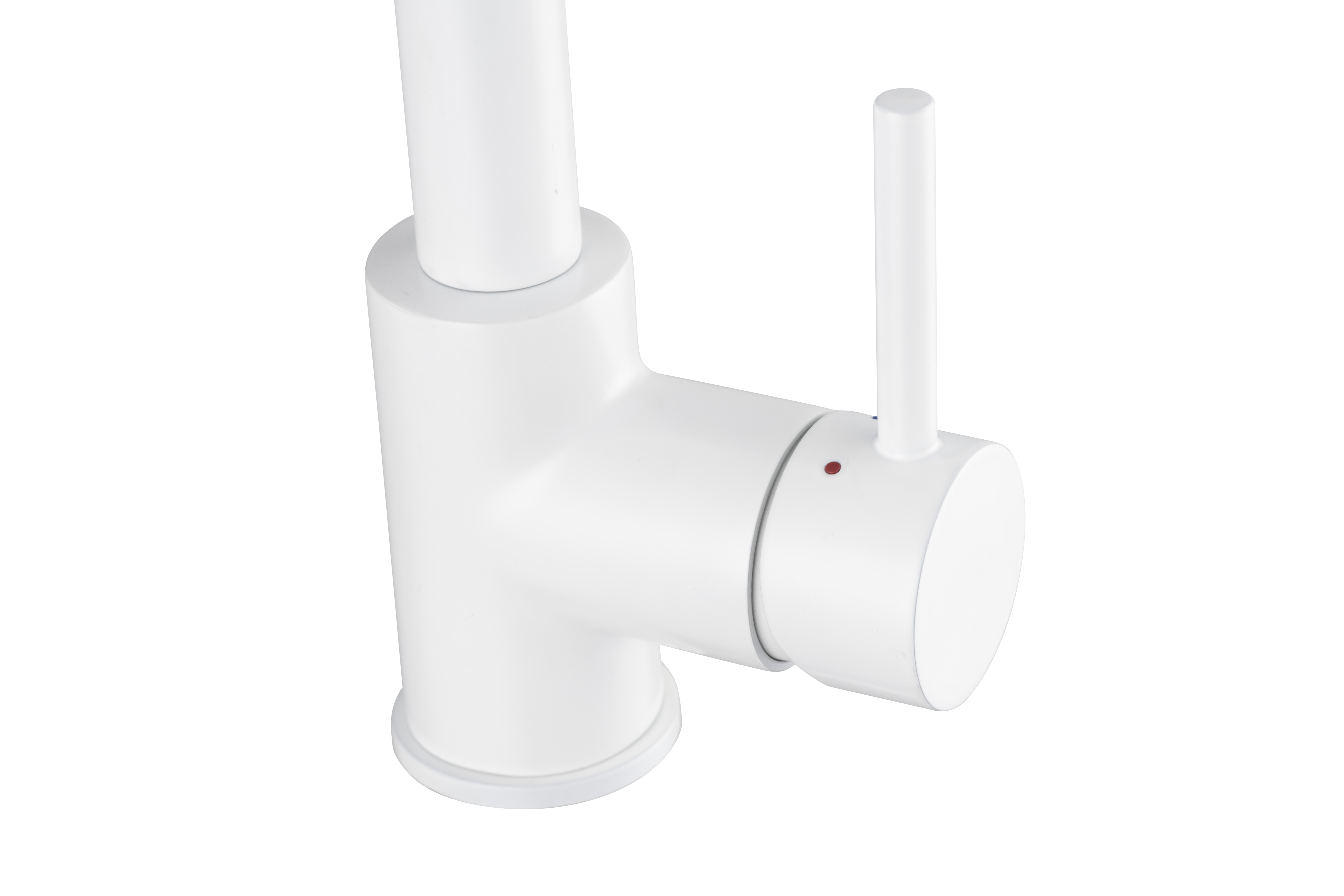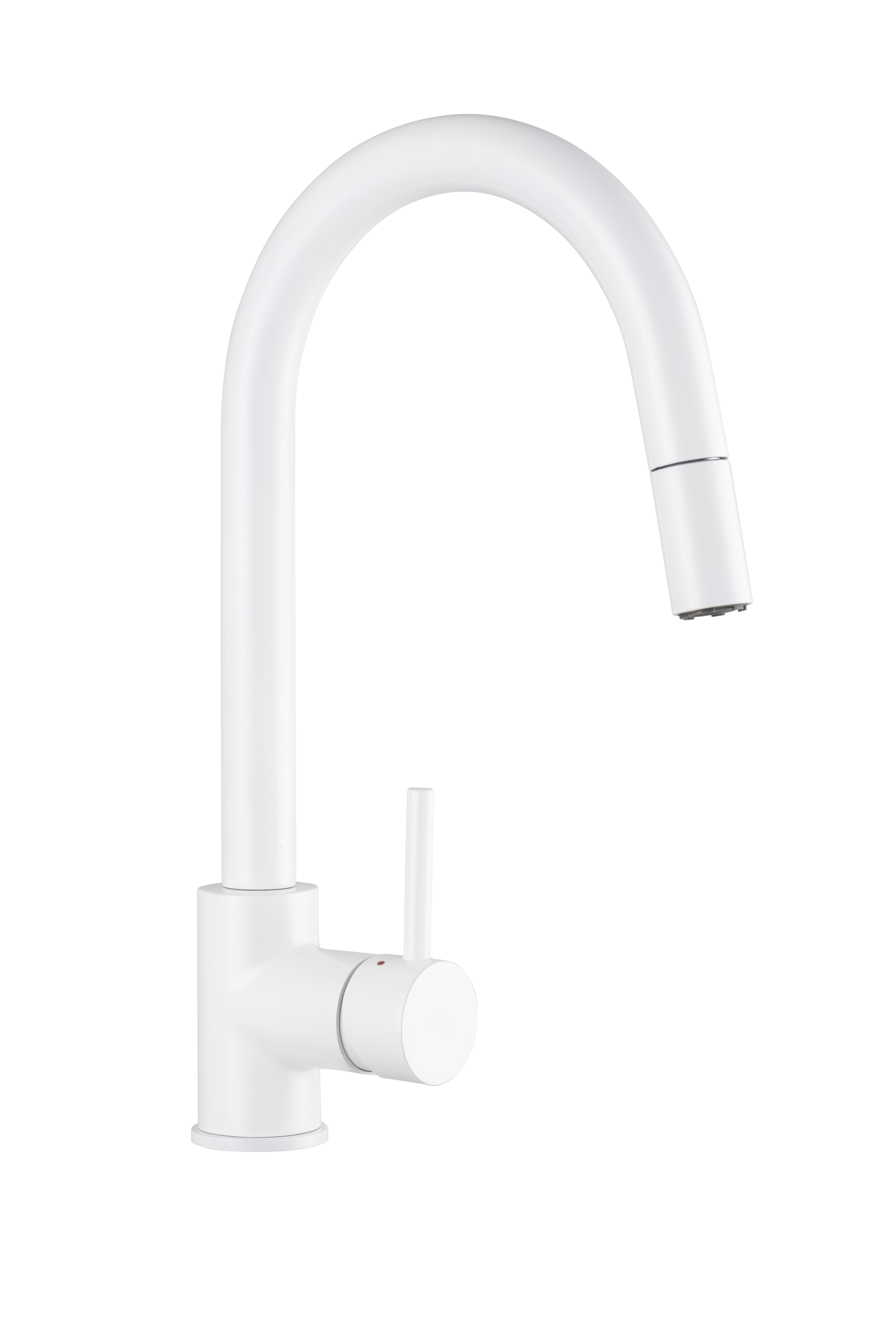 Bluerain køkkenarmatur med udtræk sørger for, at funktionalitet og design går hånd i hånd. Designet er minimalistisk med stilrene træk og en flot hvid finish, og formen er kendetegnet ved den elegante U-tud. Armaturet er praktisk at bruge i hverdagen grundet højden, den svingbare tud og udtrækningsfunktionen, der øger fleksibiliteten. Det betjenes med et-grebs-styring, som gør det nemt at opnå den ønskede vandtryk og temperatur. I leveringen medfølger fleksible tilslutningsslanger i rustfrit stål, og produktet har 5 års garanti.