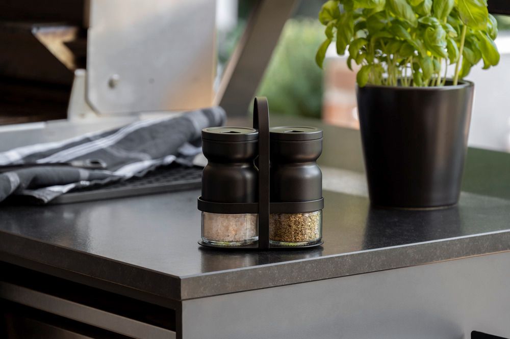 Glasbeholderen er kombineret med låg og holder, der er lavet af sort, pulverlakeret metal. Sættet passer perfekt ind i Black Outdoor Kitchen serien.