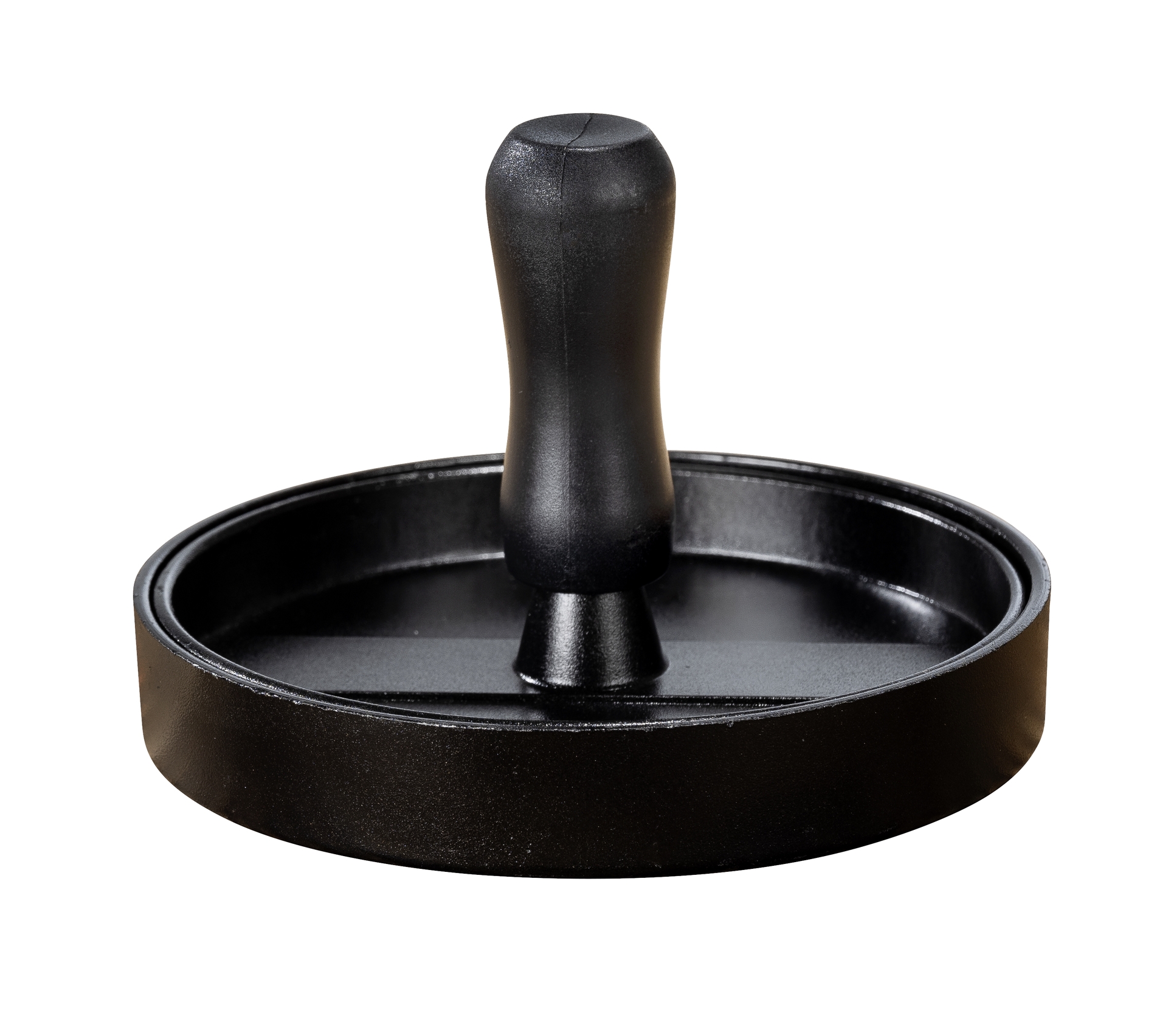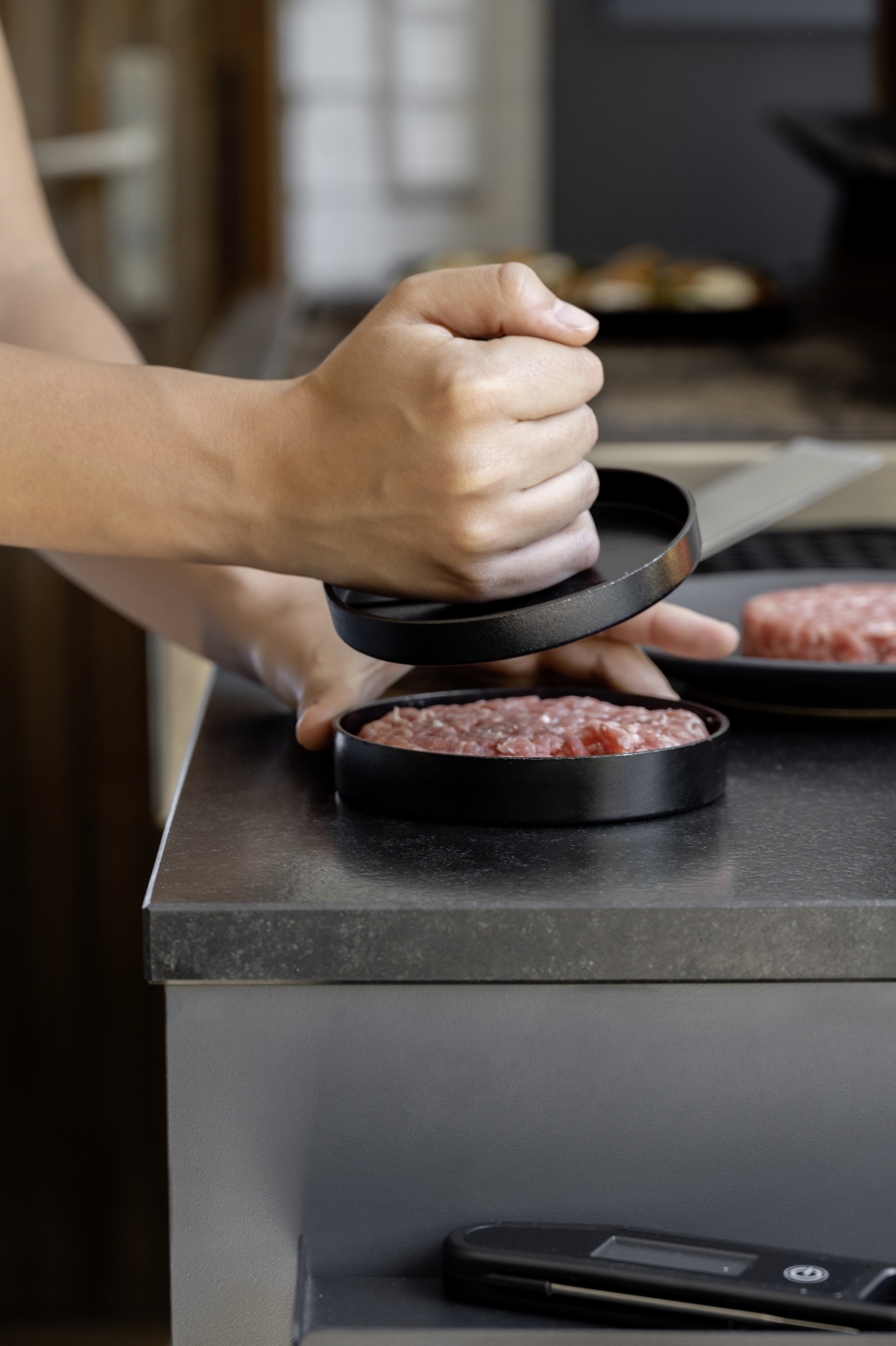 Denne burgerpresser sikrer en jævn formning af burgerbøffer og har en riflet overflade. Den er fremstillet af aluminium med et plastikhåndtag og har en non-stick belægning, der gør det nemt at frigøre bøfferne og rengøre presseren. Produktet er en del af BLACK OUTDOOR KITCHEN-serien og måler Ø 12 cm x 8 cm i højden.