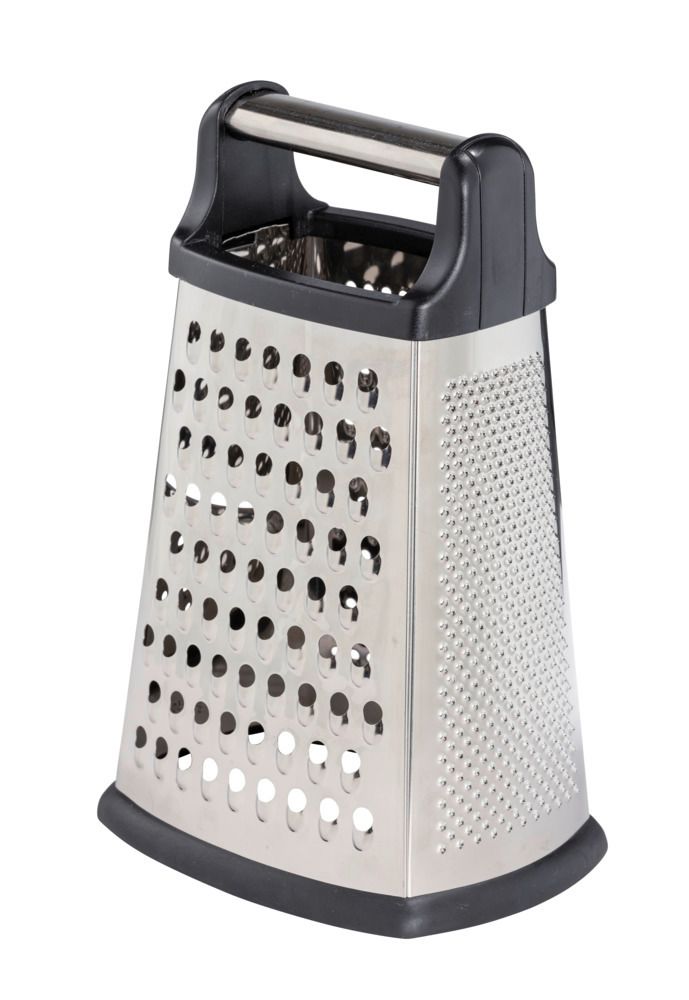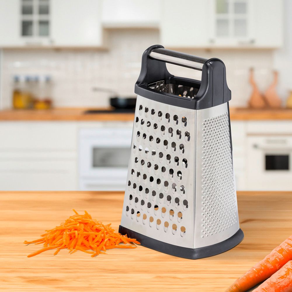 Denne højkvalitets firkantede køkkenrivet er fremstillet af rustfrit stål og har fire skarpe riveflader: skiver, grov, medium og fin rivning. Den er ideel til at rive grøntsager, frugt, ost og krydderier. Det ekstra brede håndtag og den skridsikre bund sikrer et sikkert greb under brug.