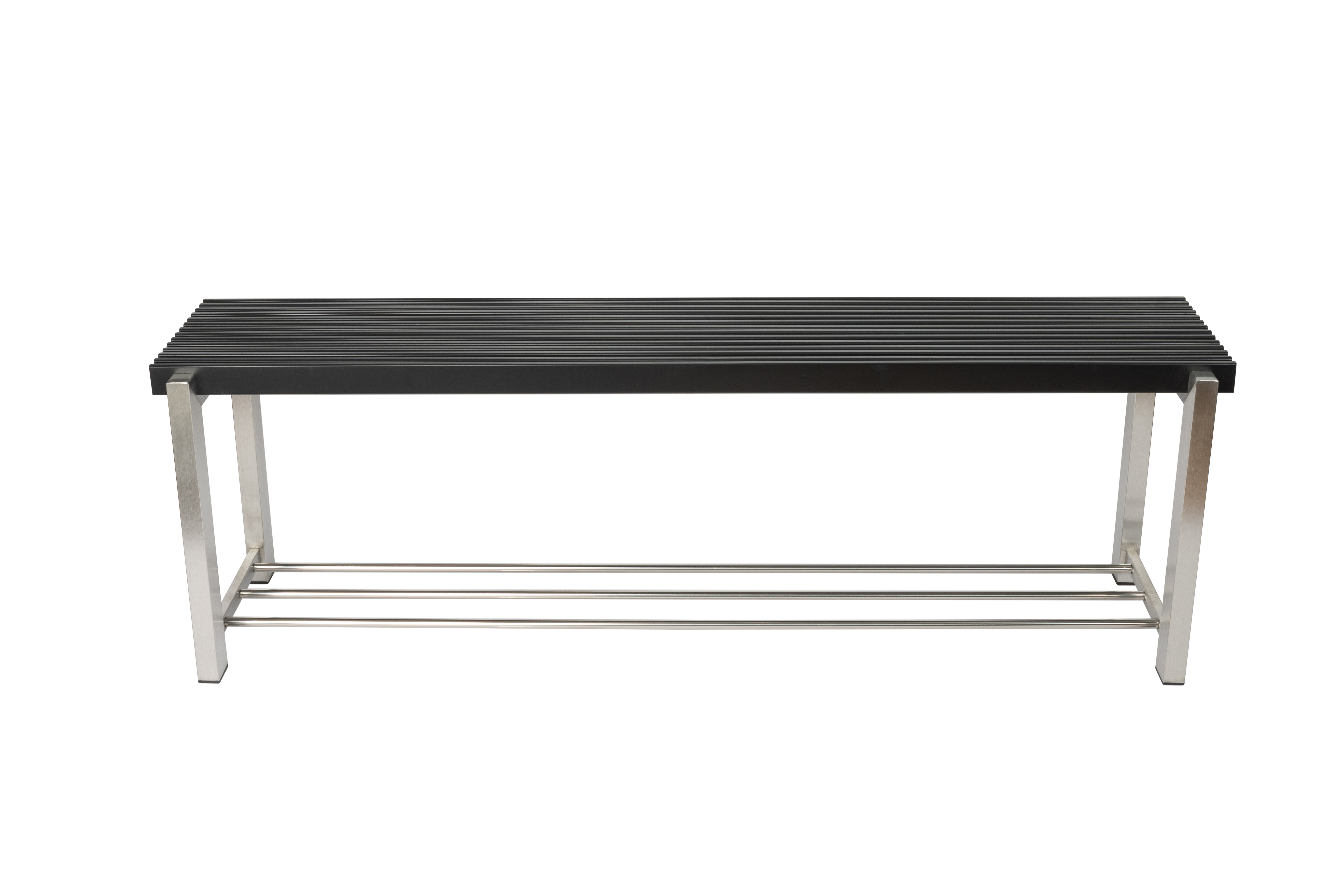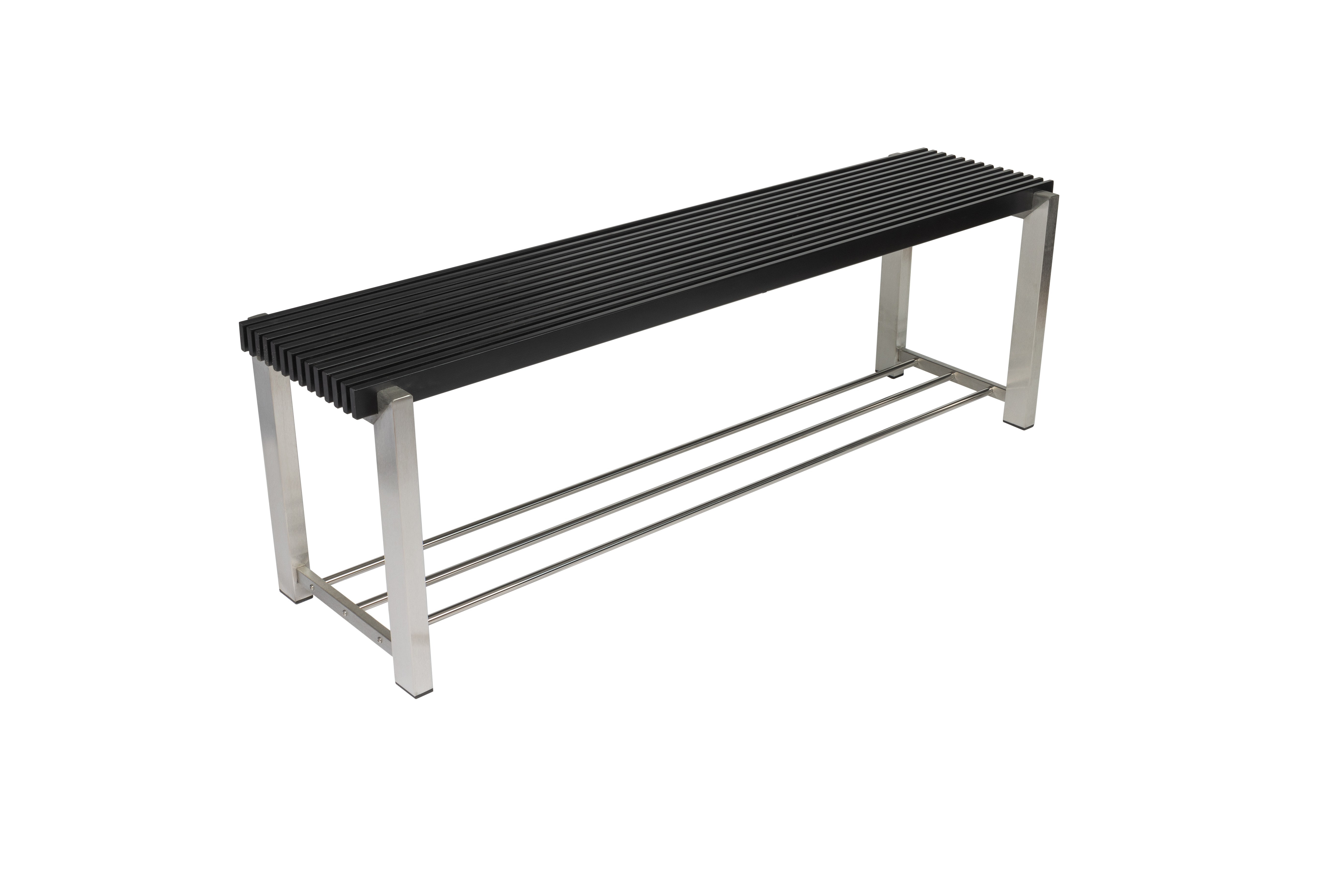 Norline bænk udgør en 2 i 1 løsning, idet bænken også rummer en hylde til opbevaring af sko eller kurve til småopbevaring. Designet er klassisk med sine lige linje og kantede look, og de massive ben samt materialerne af massivt træ og rustfrit stål giver bænken substans og sikrer en god kvalitet. Bænkens siddeplads består af 14 trælameller af sortlakeret træ, hvor mellemrummet mellem hver trælamel er med til at give designet et let og luftigt udtryk. Materialer er desuden slidstærke, således at de kan holde til mange års daglig slid. Norline bænken leveres i forskellige længder, så den passer ind i enhver entré.