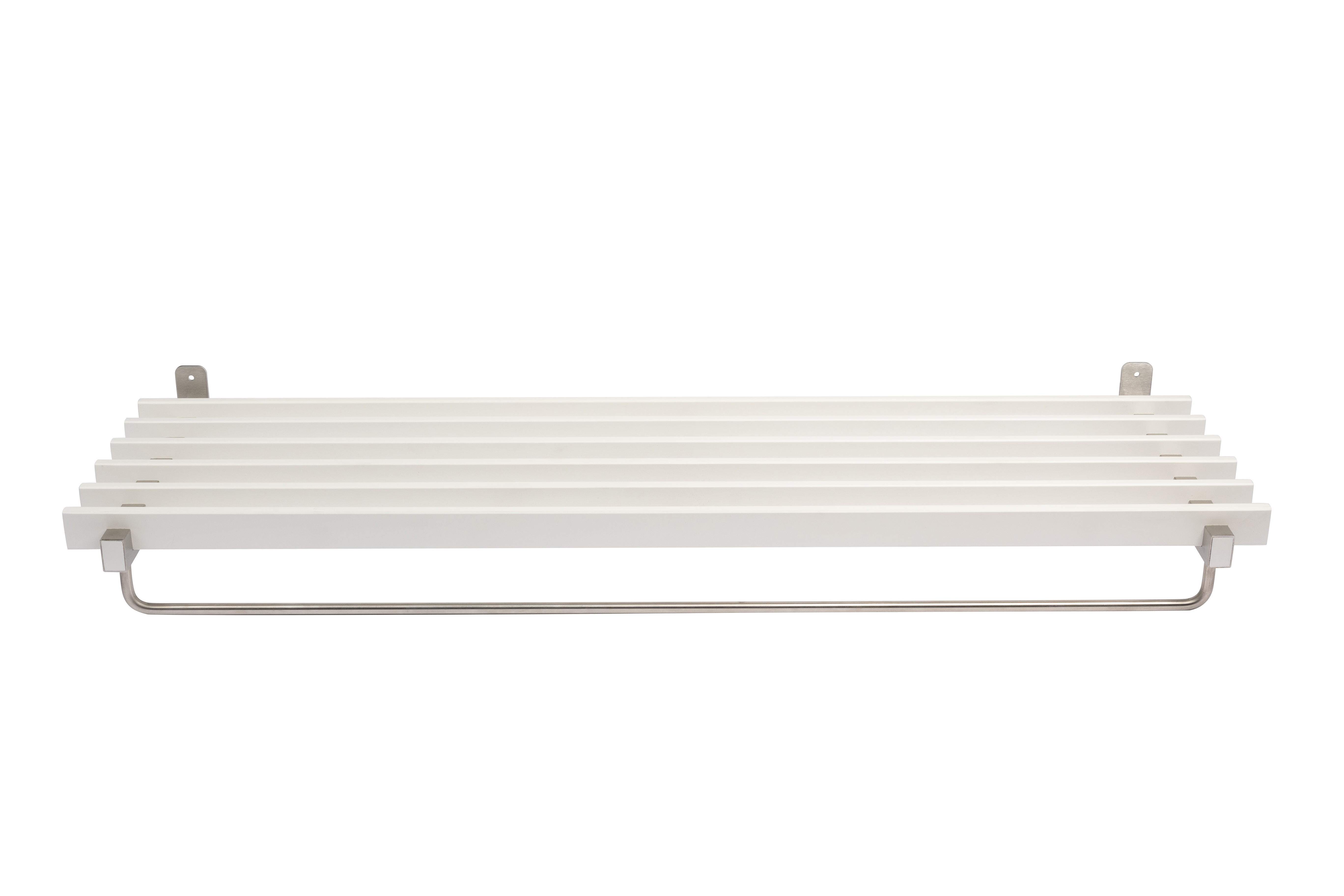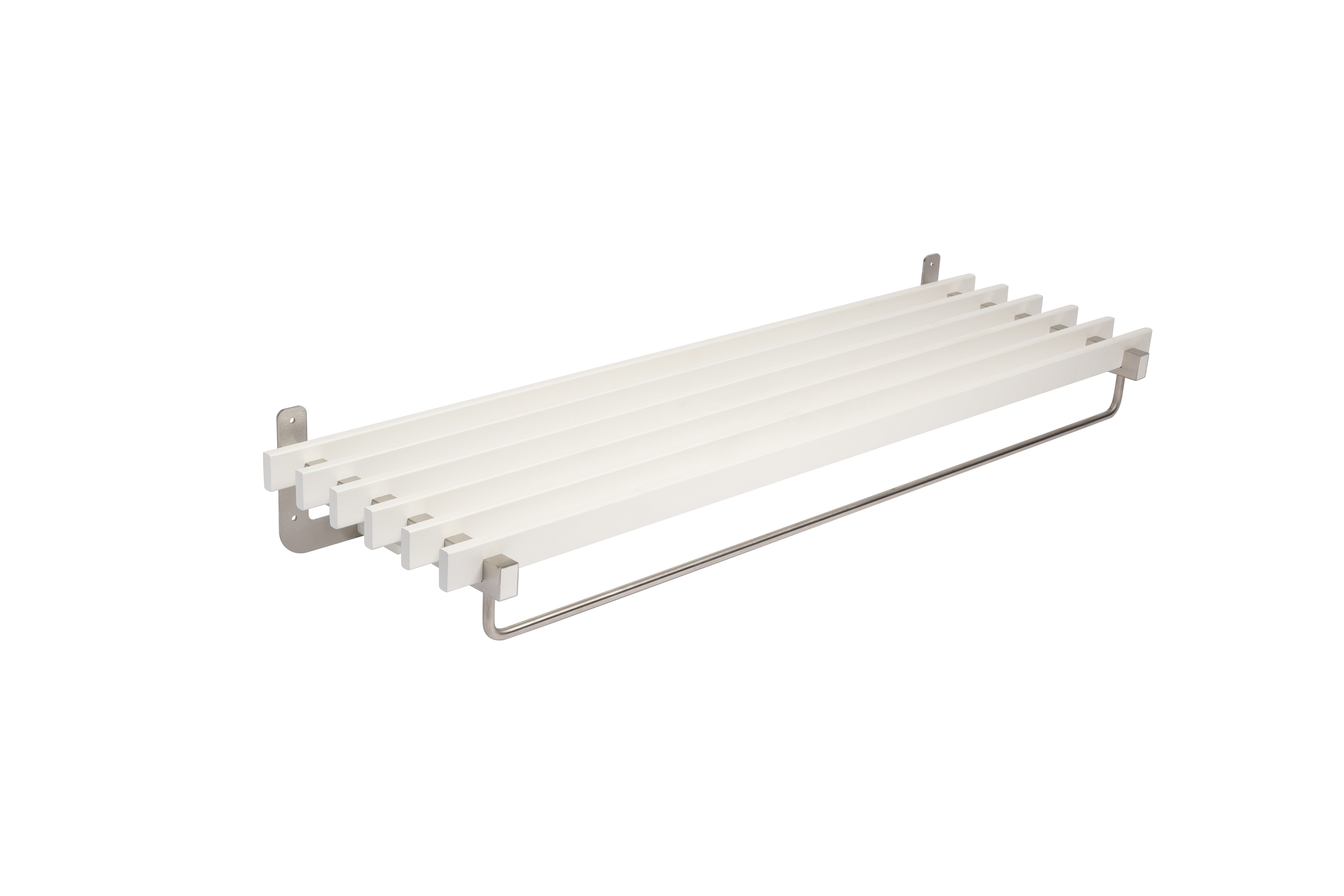 Norline hattehylde er en moderne fortolkning af den klassiske hattehylde. Møblet danner rammerne for en multifunktionel opbevaring af overtøj i entréen med sin hylde, knagerække og bøjlestang. Hattehylden består af rustfrit stål og hvidlakeret, massivt træ, der sikrer et gennemført kvalitetsprodukt. De 6 massive trælameller udgør hylden, hvorpå cykelhjelme, hatte eller kurve til småopbevaring kan placeres. Herunder er knagerækken med 5 hvide træknager, der med sine elegante udskæringer former fordybninger til ophæng af jakker. Denne diskrete detalje er med til at give hattehylden karakter. På bøjlestangen er der yderligere plads til overtøj – her er det muligt at fuldende looket med Norline bøjle.