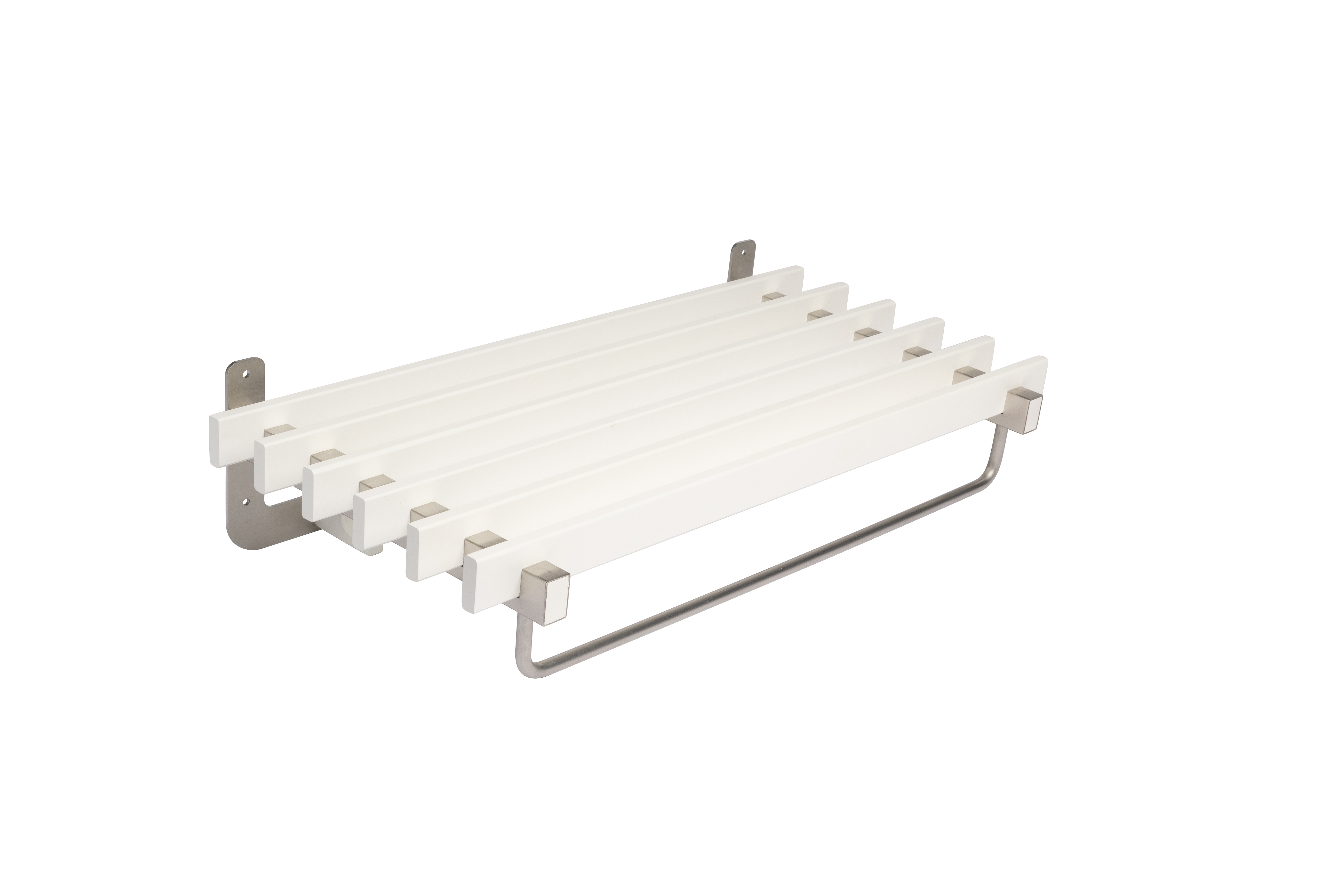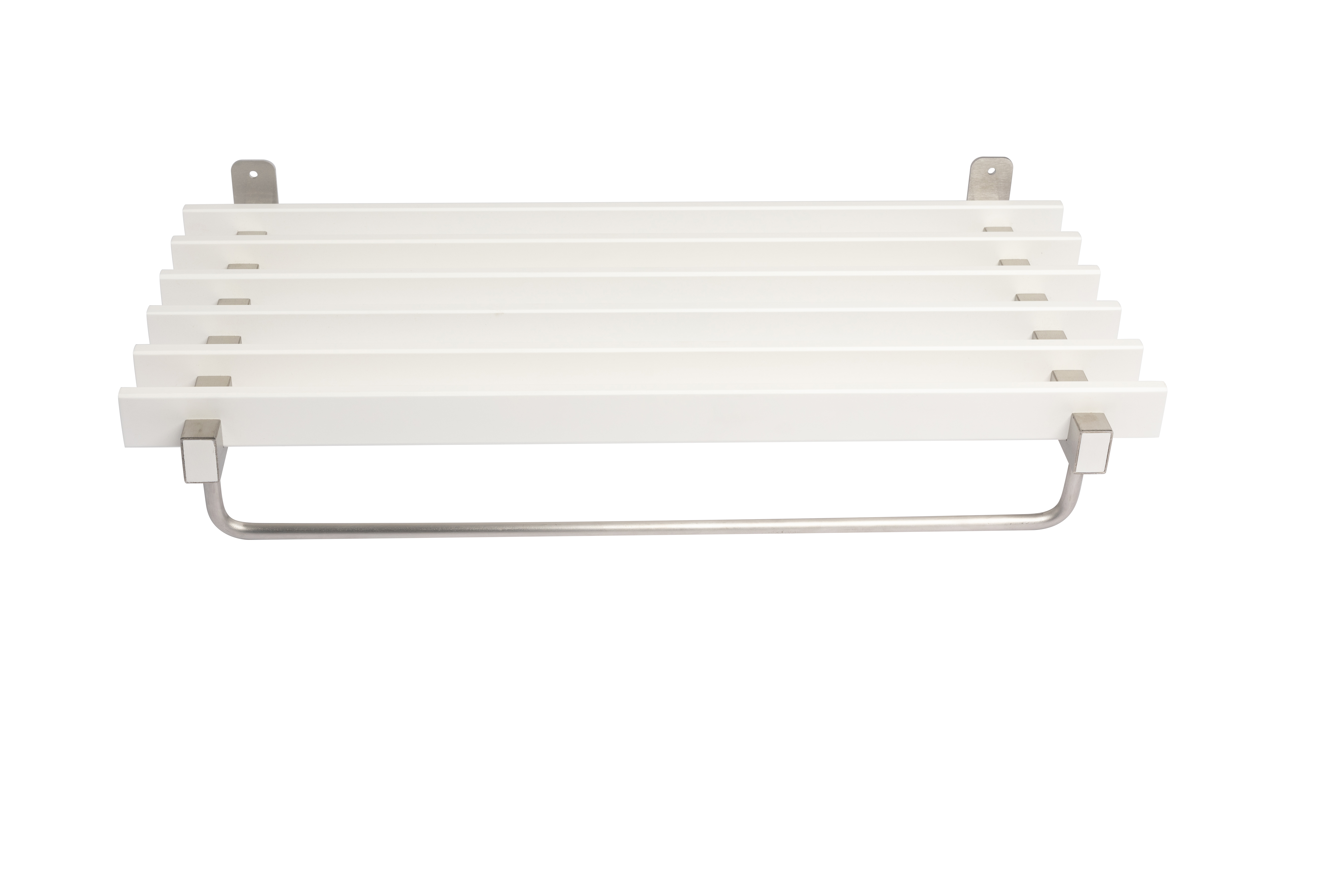 Norline hattehylde er en moderne fortolkning af den klassiske hattehylde. Møblet danner rammerne for en multifunktionel opbevaring af overtøj i entréen med sin hylde, knagerække og bøjlestang. Hattehylden består af rustfrit stål og hvidlakeret, massivt træ, der sikrer et gennemført kvalitetsprodukt. De 6 massive trælameller udgør hylden, hvorpå cykelhjelme, hatte eller kurve til småopbevaring kan placeres. Herunder er knagerækken med 4 hvide træknager, der med sine elegante udskæringer former fordybninger til ophæng af jakker. Denne diskrete detalje er med til at give hattehylden karakter. På bøjlestangen er der yderligere plads til overtøj – her er det muligt at fuldende looket med Norline bøjle.