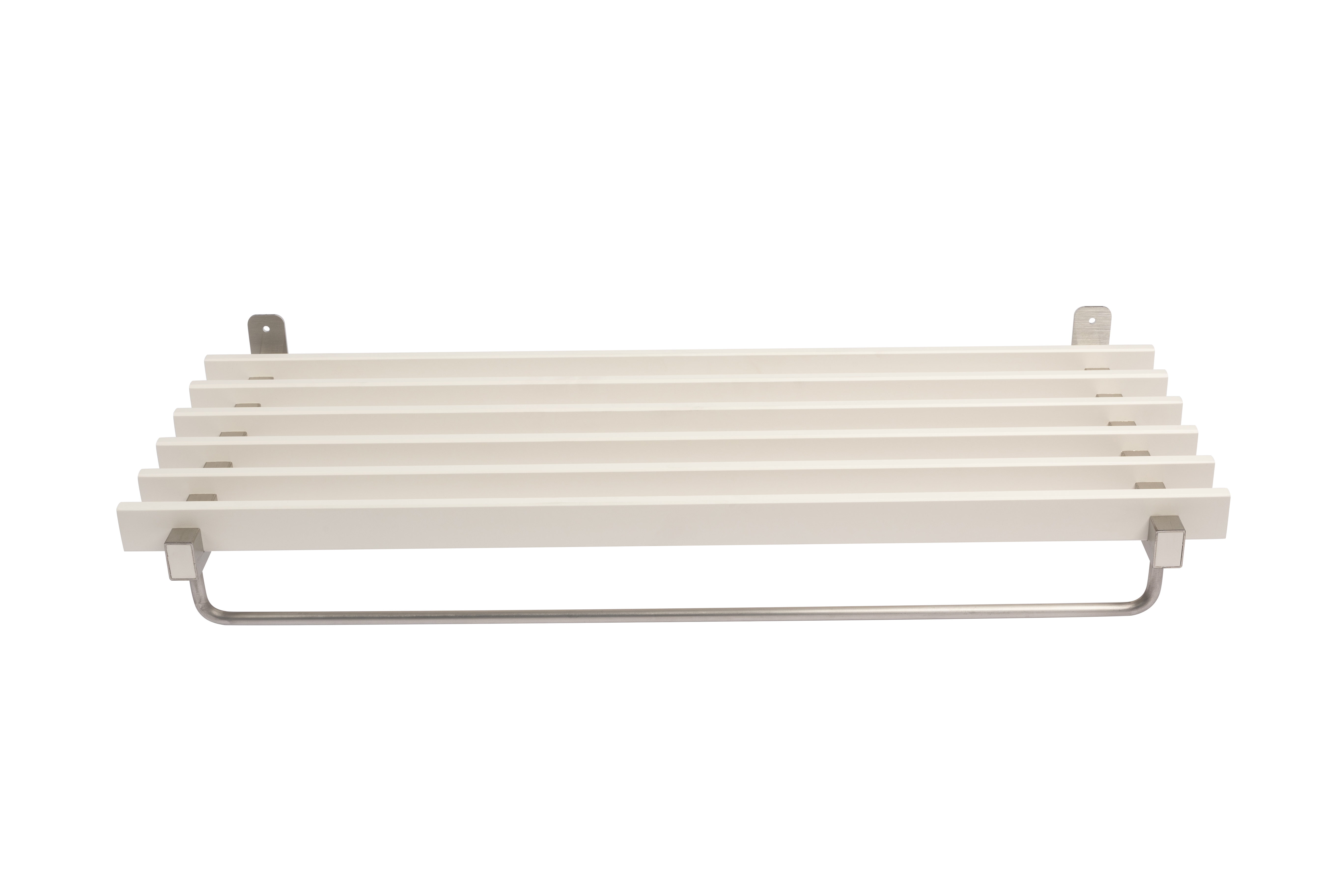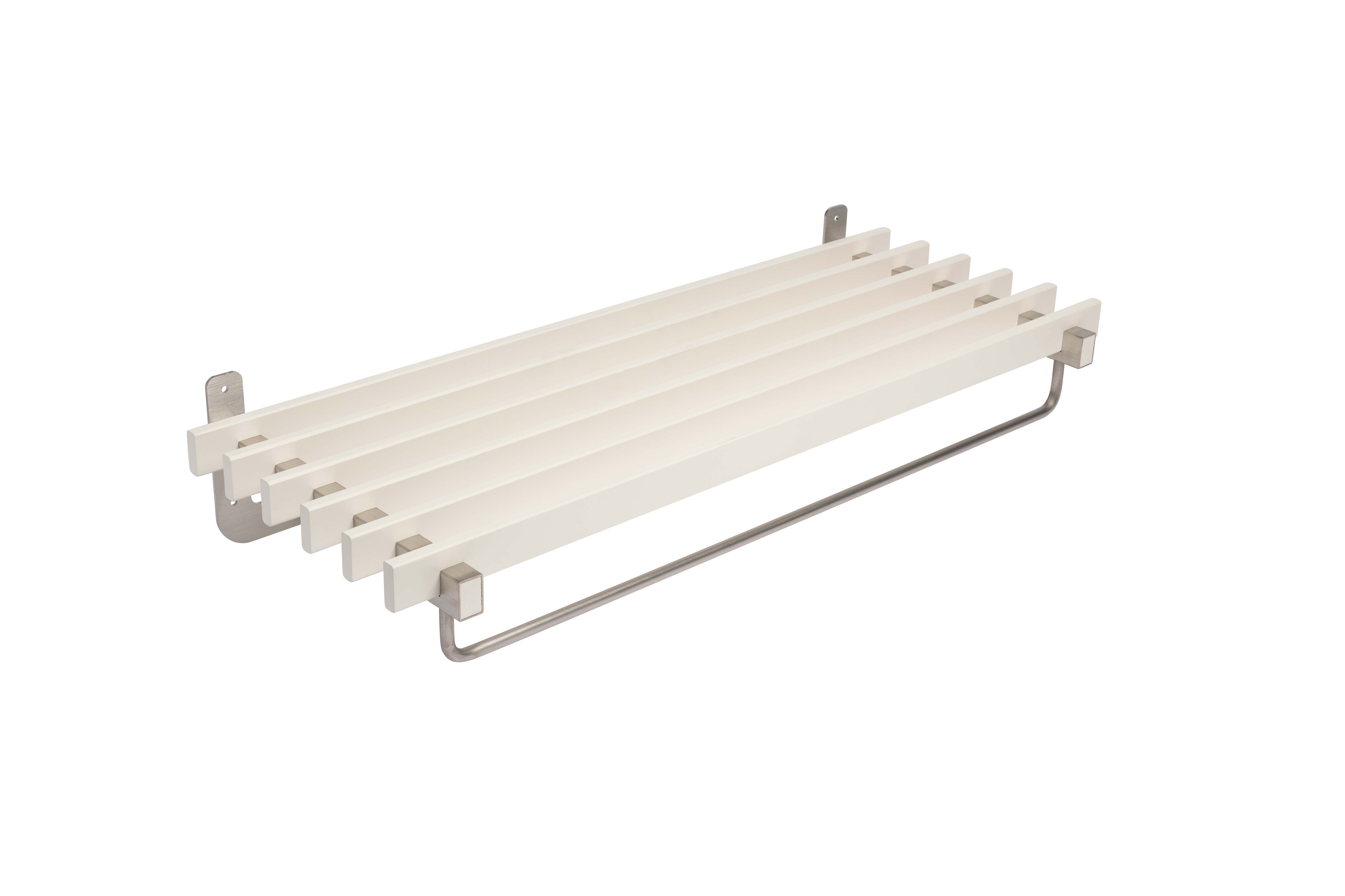 Norline hattehylde er en moderne fortolkning af den klassiske hattehylde. Møblet danner rammerne for en multifunktionel opbevaring af overtøj i entréen med sin hylde, knagerække og bøjlestang. Hattehylden består af rustfrit stål og hvidlakeret, massivt træ, der sikrer et gennemført kvalitetsprodukt. De 6 massive trælameller udgør hylden, hvorpå cykelhjelme, hatte eller kurve til småopbevaring kan placeres. Herunder er knagerækken med 5 hvide træknager, der med sine elegante udskæringer former fordybninger til ophæng af jakker. Denne diskrete detalje er med til at give hattehylden karakter. På bøjlestangen er der yderligere plads til overtøj – her er det muligt at fuldende looket med Norline bøjle.